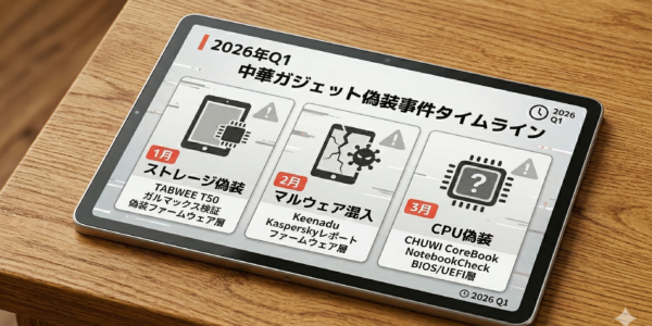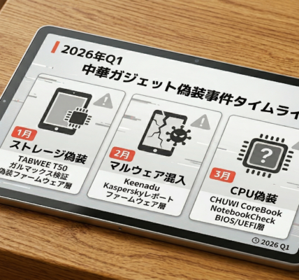 2026年最新の中華タブレット・PC偽装事件を総括。CHUWIのCPU偽装(Ryzen 5 7430U→5500U)やTABWEEのストレージ詐称(128GB→64GB)、マルウェアKeenadu混入など、BIOS・ファームウェア層まで進化した高度な不正手口と対策を、2021年からの検証経緯と共に詳しく解説します。