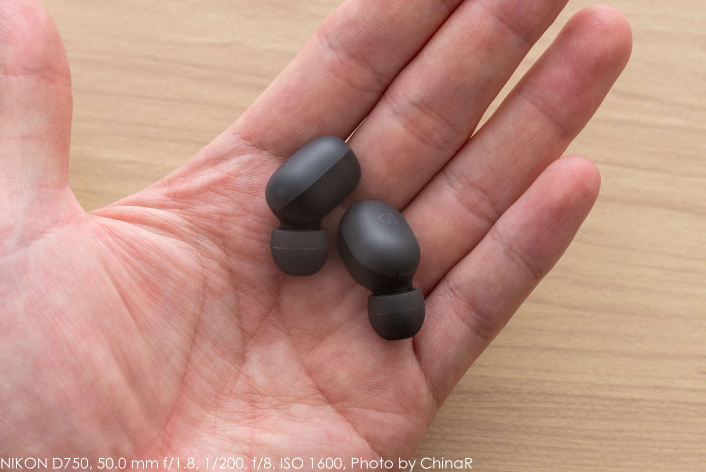 耳につけてみた感じが上の写真。小さくて軽いおかげで耳たぶに本体が接触している面積も最小限。他のワイヤレスイヤホンに比べて軽量なこともあってか、耳に何かをつけているという違和感が最小限に抑えられているようにも感じました。