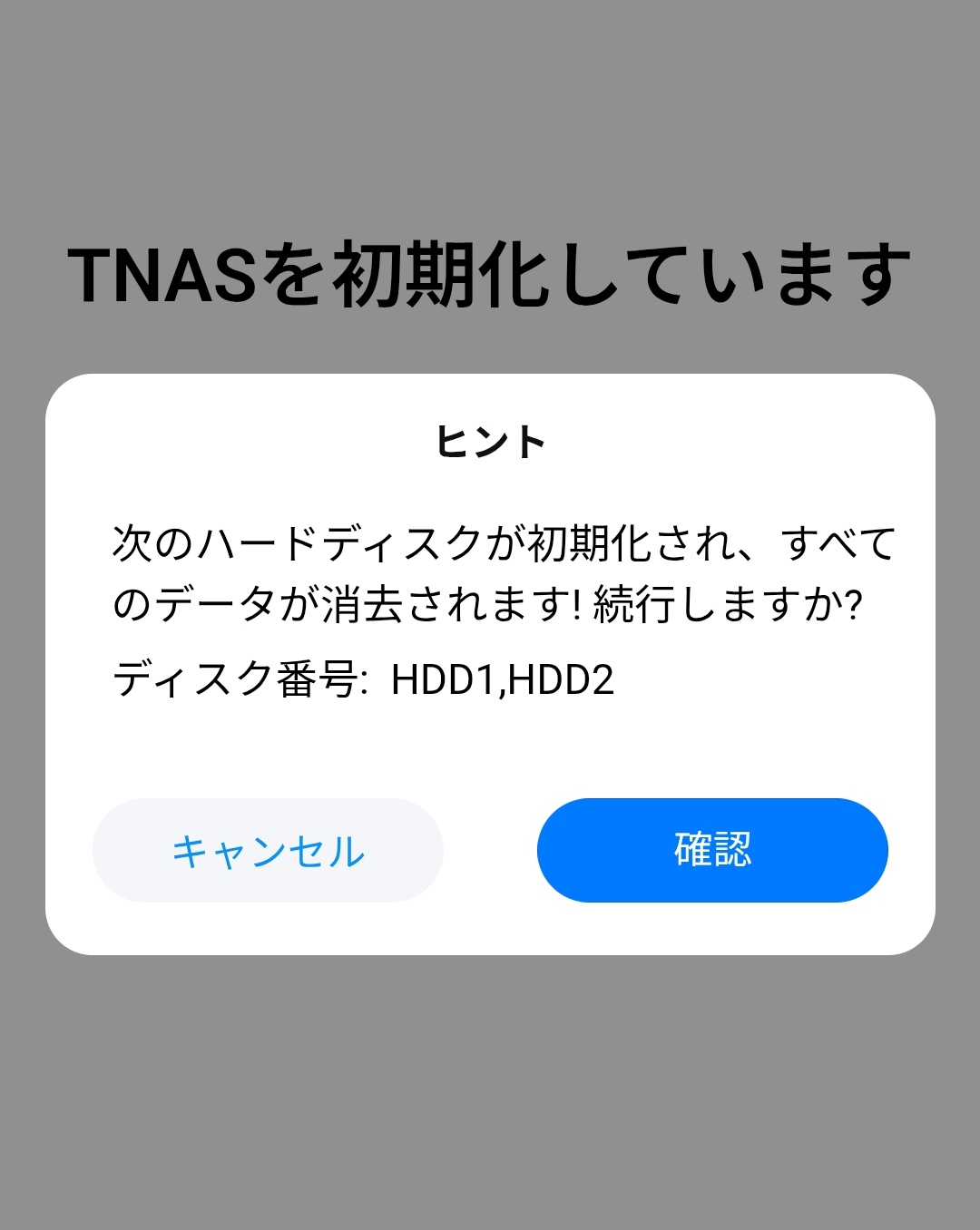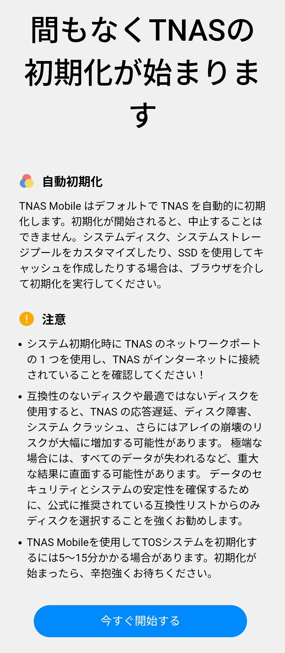 TERRAMASTER F2-425のセットアップは、専用のスマートフォンアプリTNAS Mobileアプリで実施するのが簡単。自宅のルーターに接続した状態でTNAS Mobileアプリを起動すれば1枚目のように未初期化のデバイスとして表示。あとは、ウィザードに従ってTNASの初期化を開始すれば問題ありません。