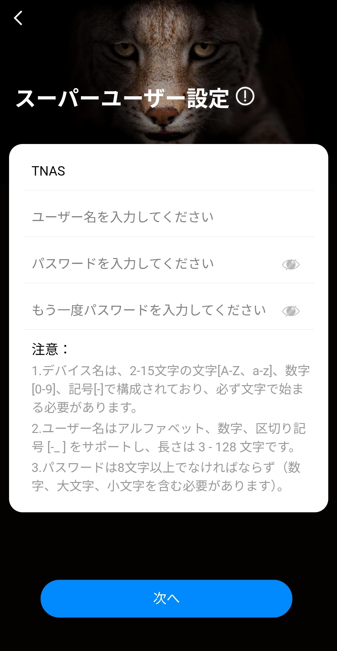 初期化が完了したらTNAS自体の設定を行うためのスーパーユーザーを設定。このスーパーユーザーは要はAdminアカウントのため安易なユーザー名を避け、十分強度なパスワードを設定しておくとベター。その後はセキュリティ用のEメールアカウントの設定を行います。メールアドレスの確認が終わったらホーム画面に遷移。ストレージプールとボリュームの作成を行います。