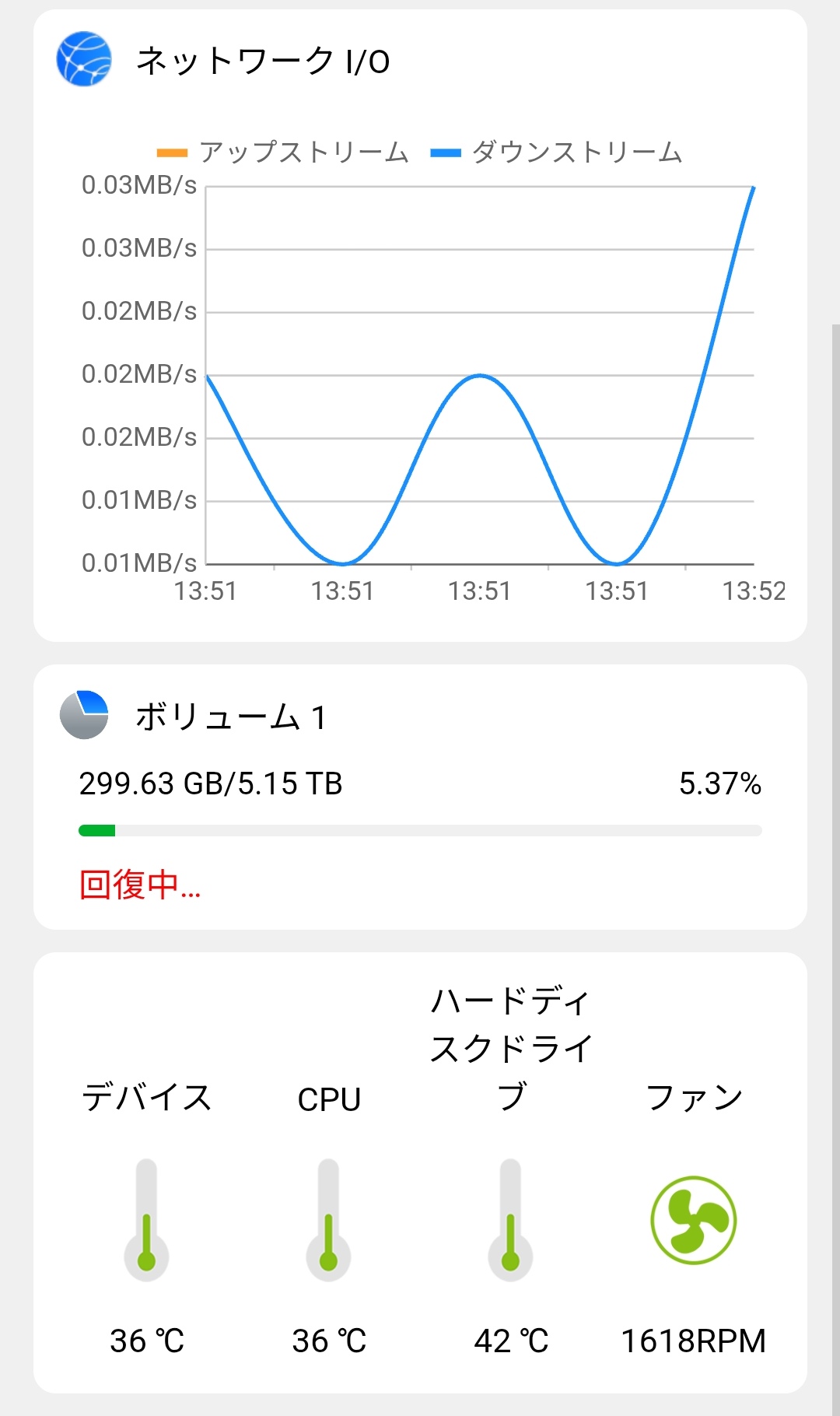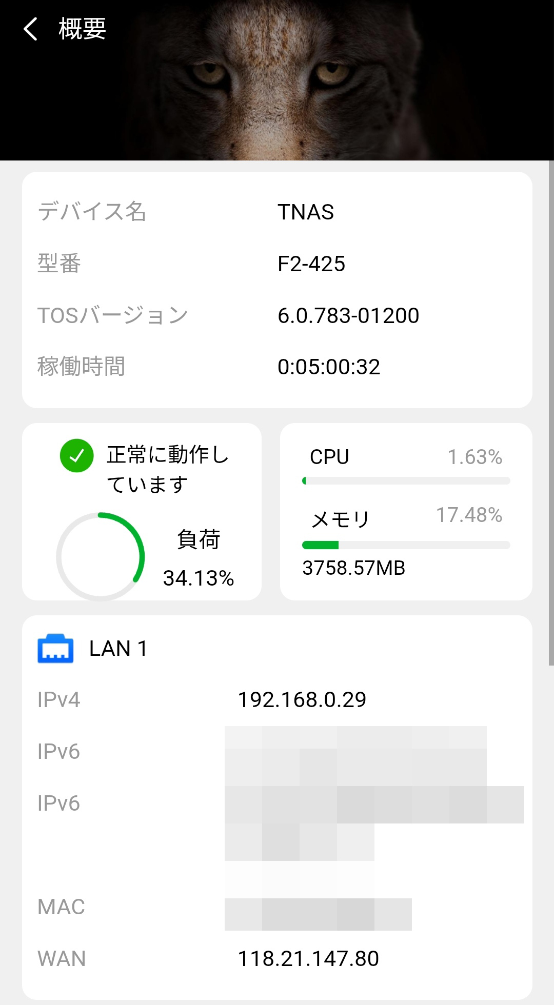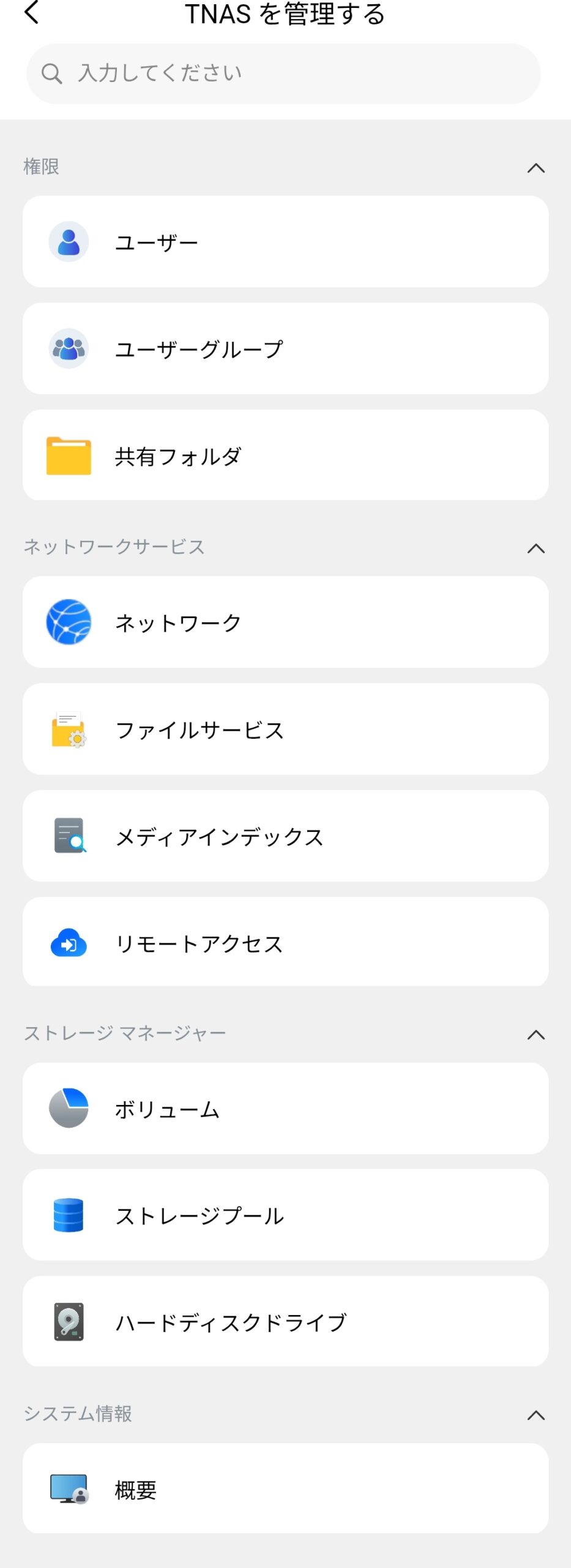 TNAS Mobileアプリのメイン画面は上記の感じ。個人のデータの保存場所を表示する部分に加えて、写真やビデオ、音楽、ドキュメントのメディアインデックス、アルバムのバックアップ、Photosのメニューが用意。また、設定側からは各種設定や本体の稼働状況についても確認することが可能です。稼働状況についてはCPU、RAMの利用状況、本体、HDDの温度やネットワーク状況も一目で確認できるようになっています。