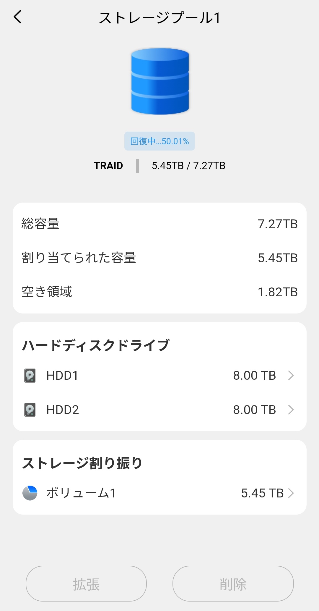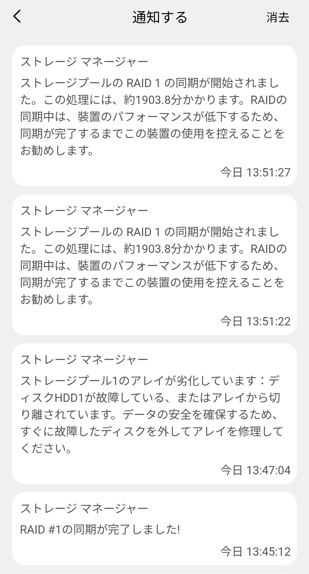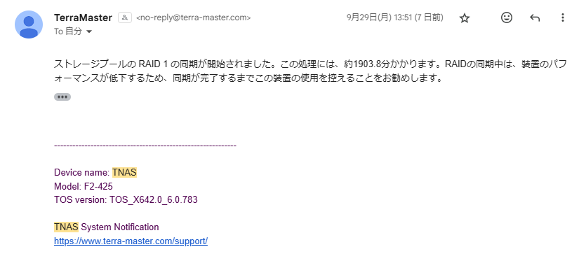 同期が開始するとアプリ上やWEB画面、メールに対してストレージプールの同期が始まったことを通知してくれます。今回は8TBのHDDを2本入れたので7.27TB分を同期します。予告された時間は1,908分=31時間!かなり長時間の表示になっています。実際に同期が完了したのは10月2日の8:32、なんと66時間もの時間がかかりました。実際にはデータの転送などを同期中に実施していたためではあるものの、数日間かかることを覚悟した方が良いかなと。