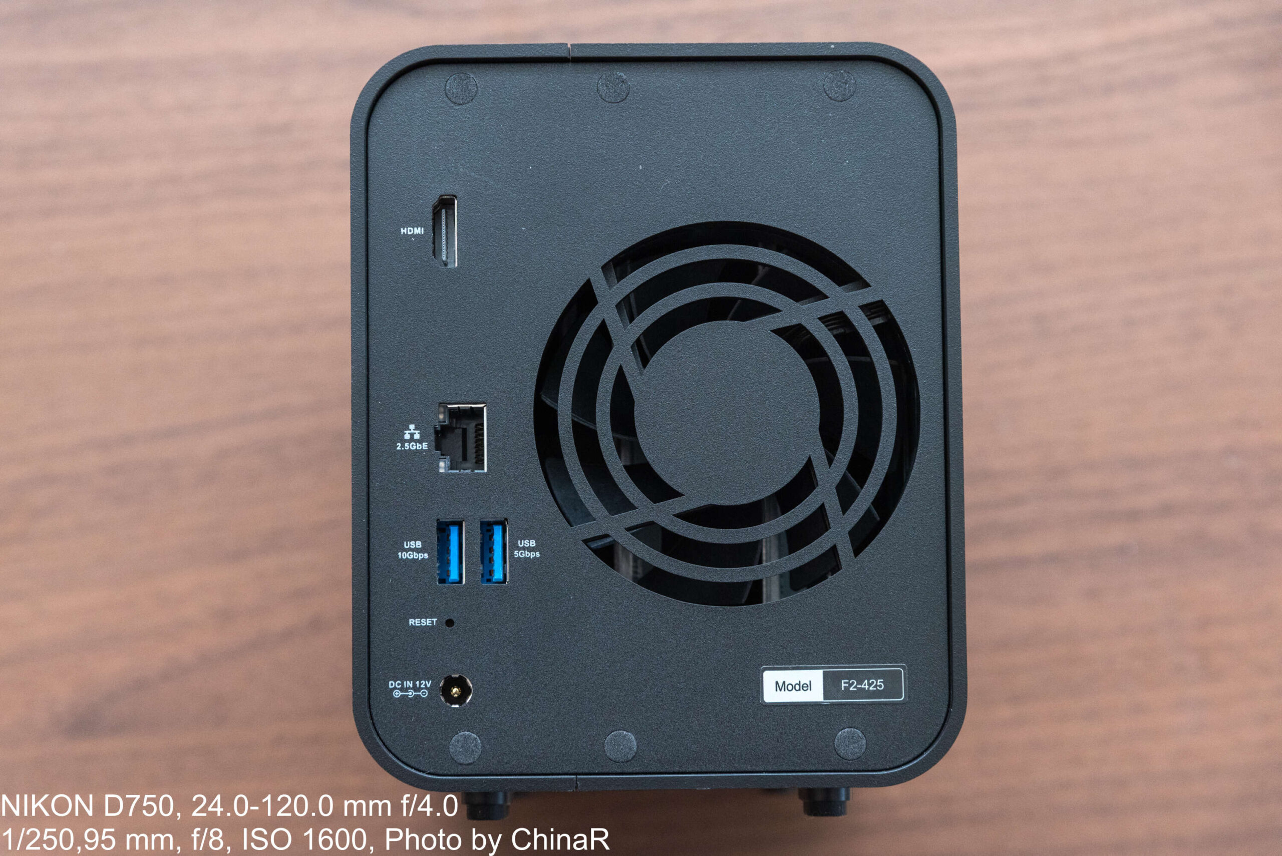 背面にはHDMI端子と2.5GbEポート、USB Type-A(10Gbps×1、2.5Gbps×1)、電源口を搭載しています。また、ファンに関しては側面のTERRAMASTERのロゴの部分、下部の給気口から吸い込み背面のファンから排気するようになっています。