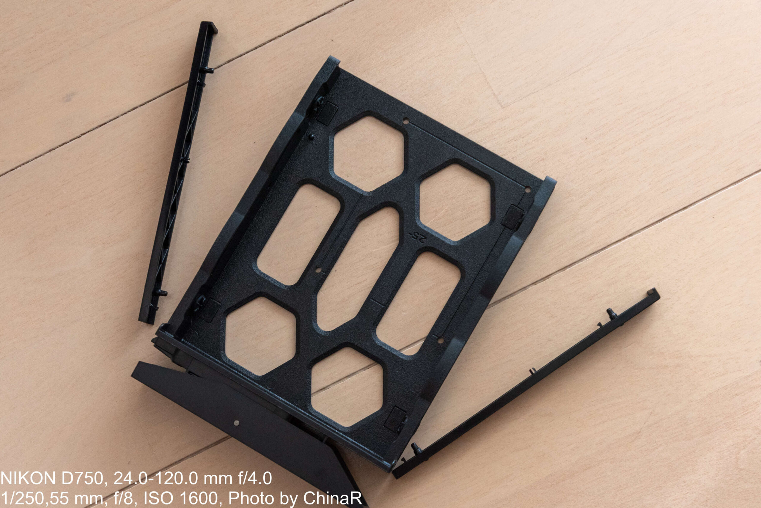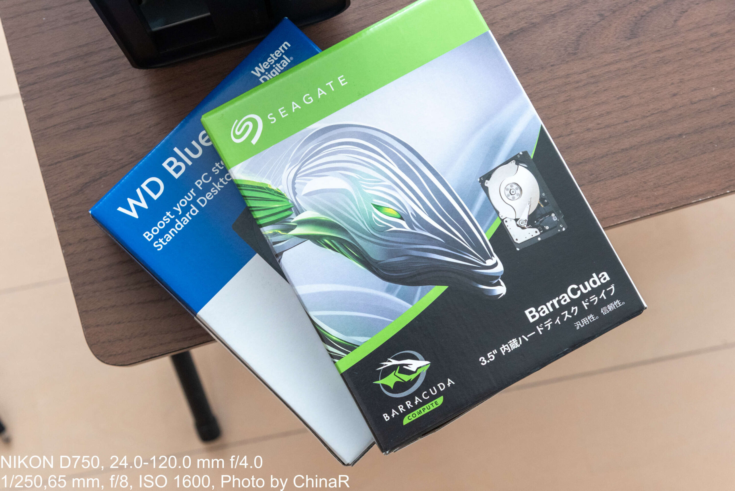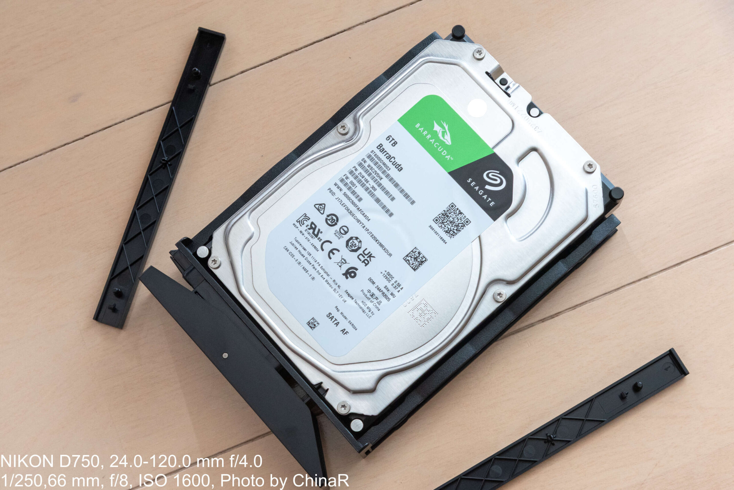 HDDの装着に関しては、HDDトレイを取り出して側面部分のゴムを外し、そのままHDDをはめたら側面を戻すだけ。今回は予算削減の観点からWD BlueとSeagateのBarraCudaシリーズのHDDを用意。8TBのものを2つ用意しRAID 1で構成をしていきます。(本来はWD RedなどのNAS向けのHDDが最適です)