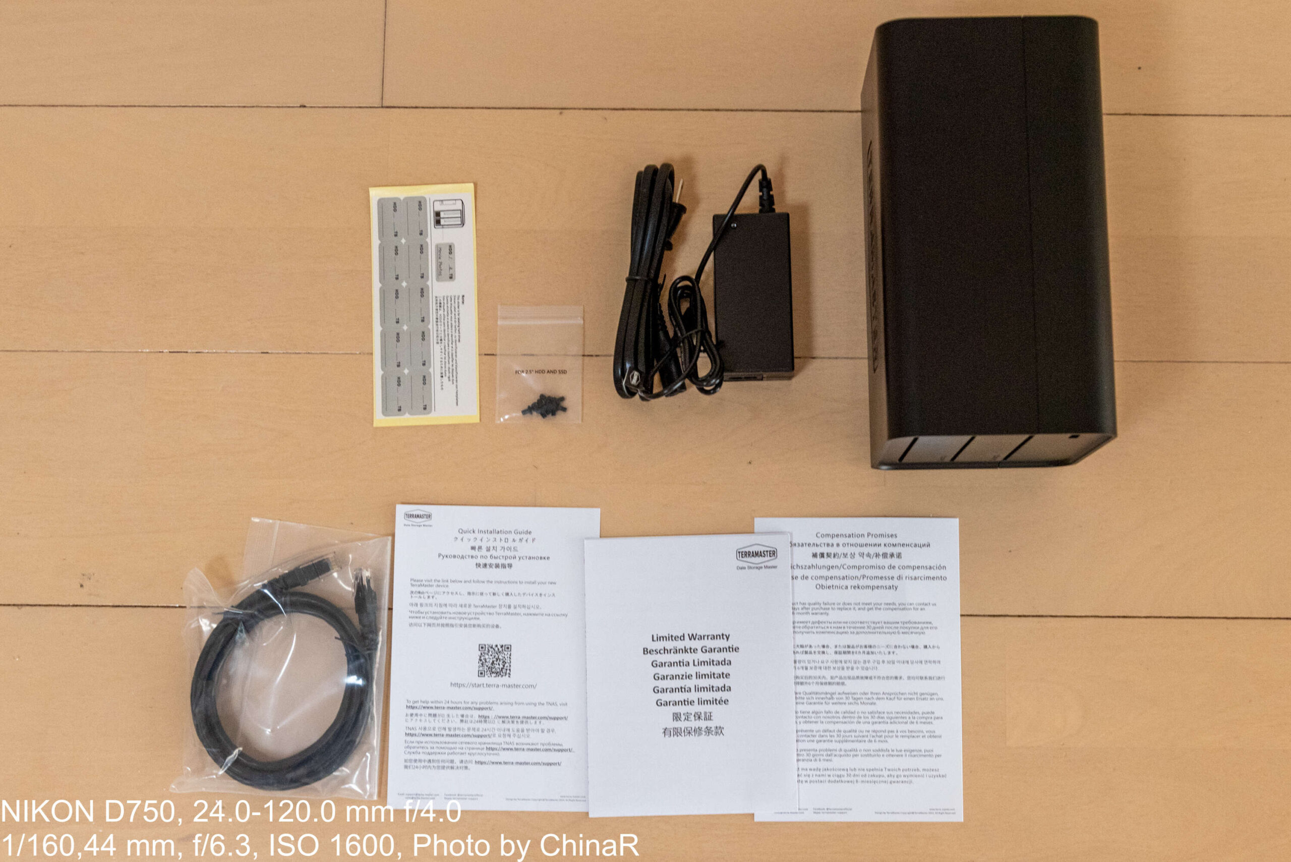 まずは本体外装から確認していきます。パッケージはクラフト地のシンプルなデザイン。TERRAMASTERのロゴが鎮座したデザインに仕上がっています。同梱品は本体の他にACアダプター、LANケーブル、保証書、クイックインストールガイド。説明書については、専用のアプリであるTNAS mobileアプリを利用して確認するようになっています。