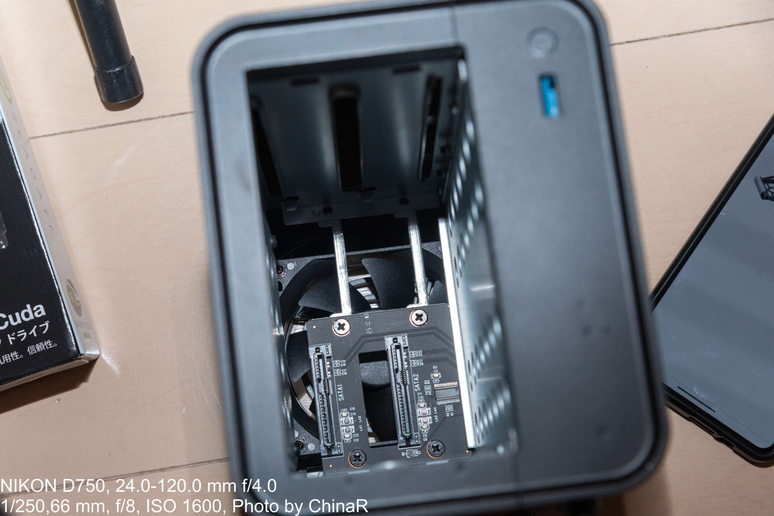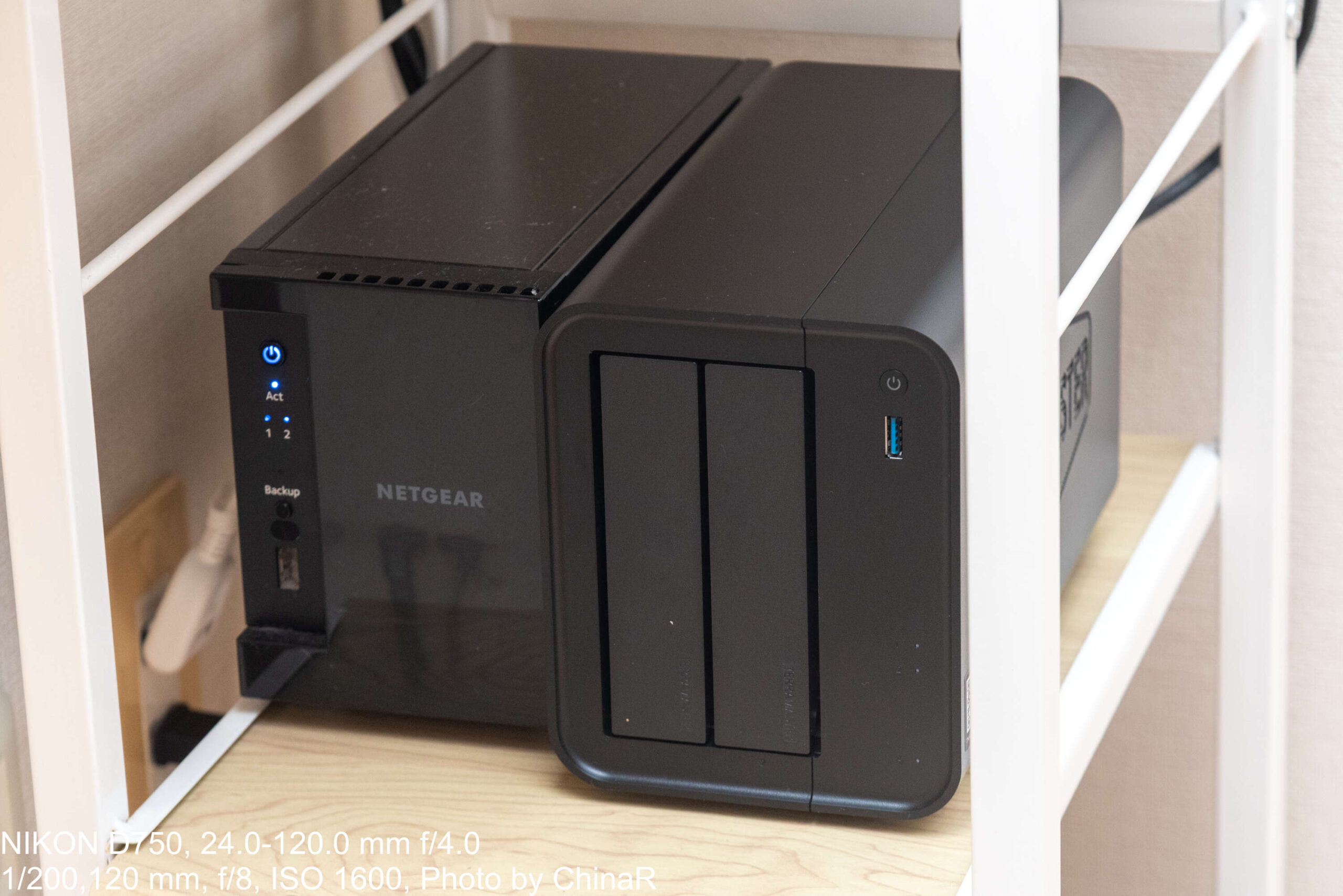 あとは、向きを間違えないようにしてHDDをそのままスロットに差し込んで装着は完了です。装着は完全に工具レスで行うことができるので簡単でした。あとは、このままルーターの近くに設置して電源をつければ設置完了です。隣りにあるのは2014年頃に購入したNETGEARのReadyNAS。性能面でも機能面でも全く異なるレベルの製品です。