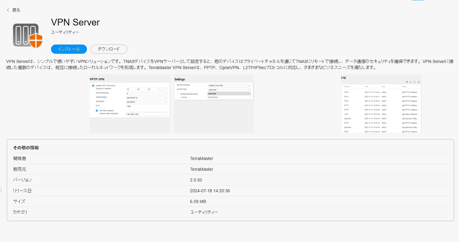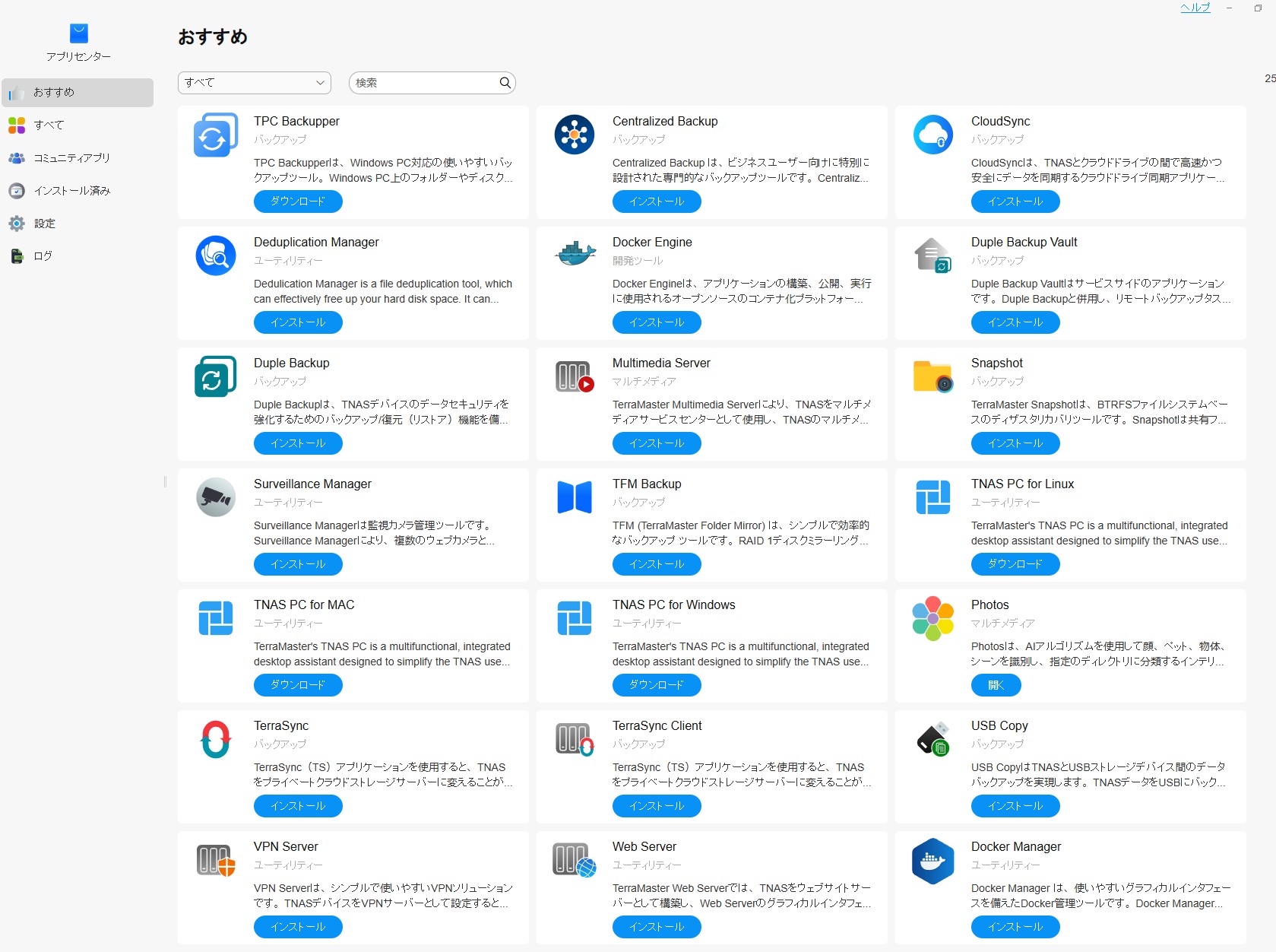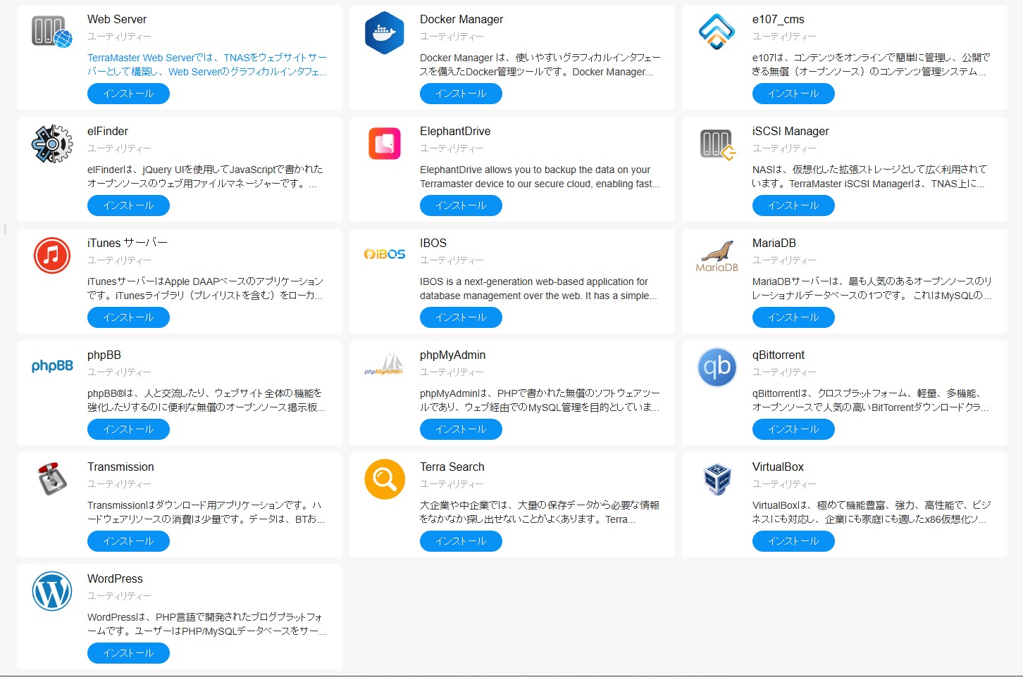 アプリケーションについてはTERRAMASTER側っで用意しているものもかなり多くあり、Windows PCのフォルダを自動で同期してくれるTPC Backupperといったバックアップソフト、Docker EngineやphpMyAdmin、Wordpressなどの開発環境、WEB環境も用意。VPN ServerをインストールすればVPNも構築できるようになっており、自身で自由に機能を拡張していけるのも特徴です。