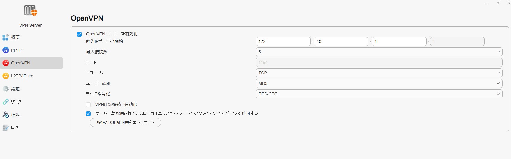 VPN Serverアプリなら、手軽にOpenVPNサーバーを構築することが可能。我が家の場合はそもそも直接IPv4で自宅側にアクセスすることができないため意味はないのですが、ルーターにVPN機能がない場合にはこちらでONにしても良いかも。OpenVPNの場合は、設定ファイルに加えて証明書もセットで出力することができるため、より安全な接続を確立することが可能です。