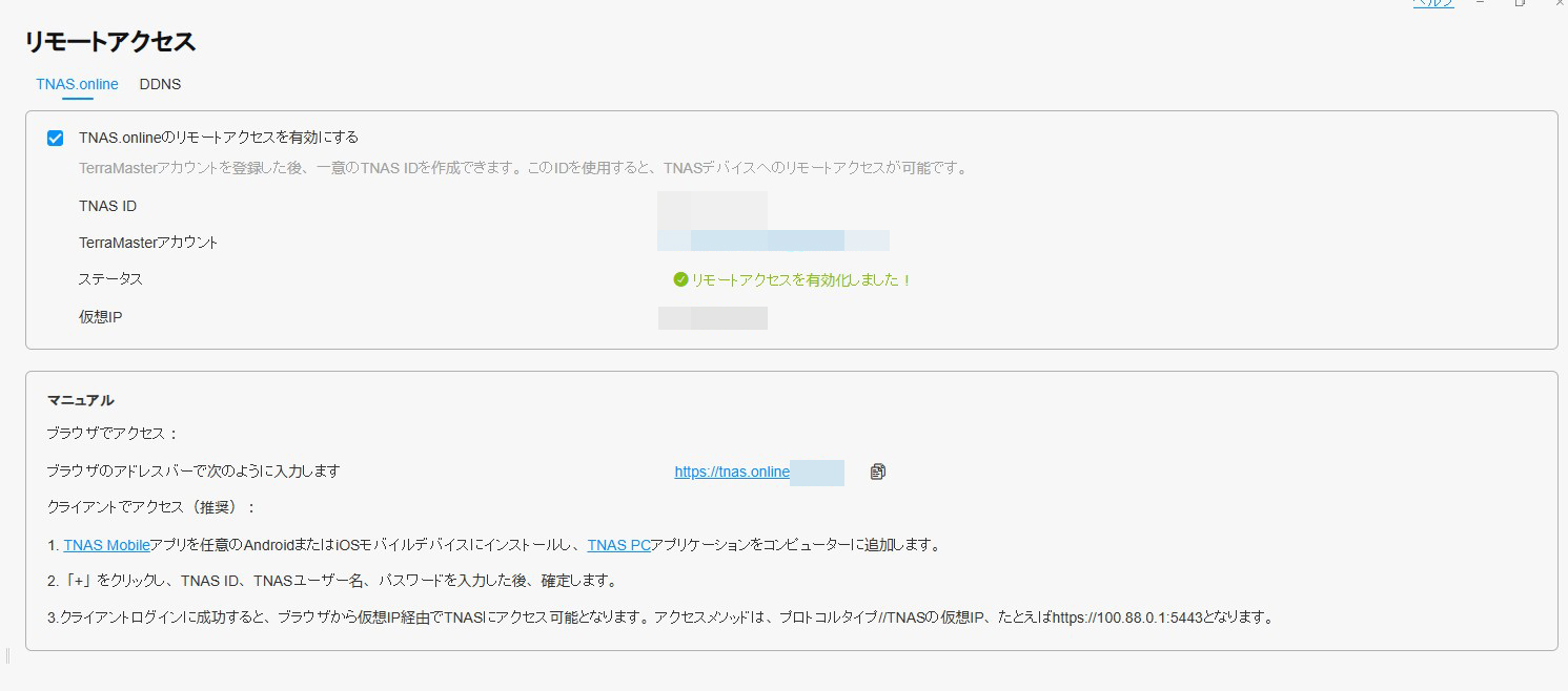 TNAS Mobileアプリや、ブラウザを経由して外出先からNASにアクセスすることも簡単なのもポイント。リモートアクセスの設定画面からTNAS.online機能をONにし、TerraMasterアカウントを紐づければ自動的に仮想IPを振ってくれ外出先から直接接続できるようになります。アクセス方法は2種類用意されており、WEBブラウザで指定されたアドレスにアクセスする方法と、スマートフォンのTNAS Mobileアプリからアクセスする方法の2種類が利用できます。