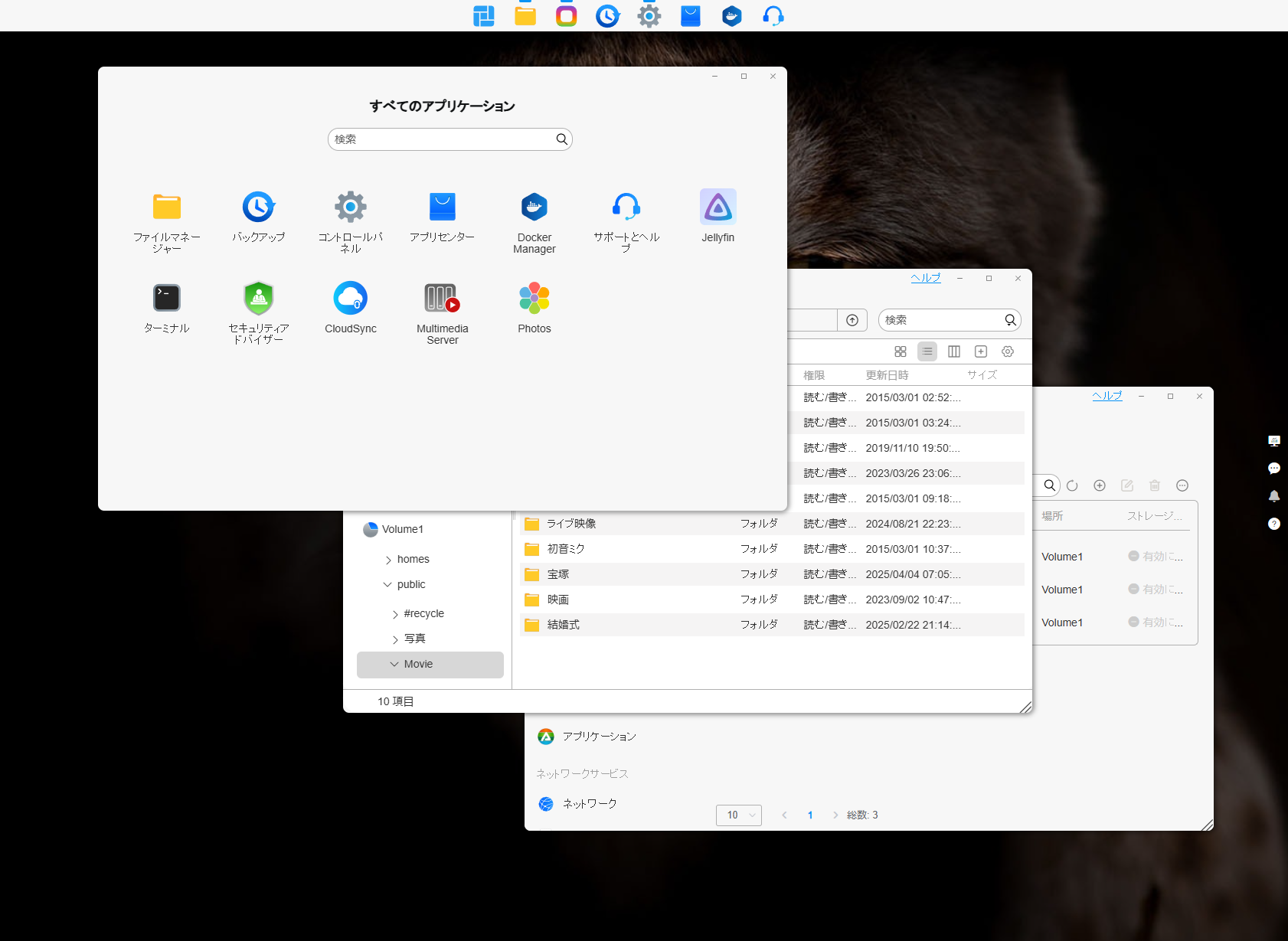TERRAMASTER F2-425の豊富な機能を支えるのが、TOS 6.0。Linuxベースで開発されたOSで、PCのような操作感を実現しているのが特徴。各アプリゲーションや設定画面を写真のようにマルチウインドウで開いていくことができ、NAS上で動いているソフトウェアの状態を変更したり、新しいアプリケーションをインストールしたり、各フォルダの権限を変更する、といったことも自由に行うことが可能です。