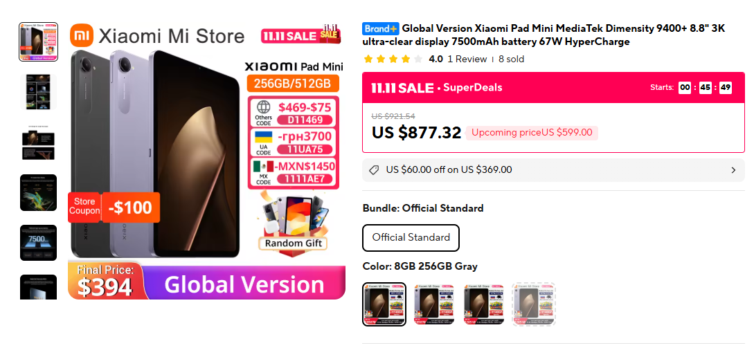 Xiaomi Pad Miniは、MediaTek Dimensity 9400+プロセッサを搭載し、8GBまたは12GB RAMと256GBまたは512GBストレージを備えます。8.8インチIPS液晶は3008×1880解像度で165Hzリフレッシュレート、700nitsピーク輝度、Dolby Vision対応です。バッテリーは7500mAhで33W急速充電をサポート。フロントカメラは8MPリアも8MP、ステレオスピーカー搭載。重量は約370gと軽量で、Android 15ベースのHyperOSを動作させます。セール価格$469は参考価格$599から27%オフ相当、11.11-11.19限定のストアクーポンJPXM130適用で実現。ポイント還元はAliExpress標準の数%分が加算され、総額を抑えられます。このスペックで動画視聴や軽作業がスムーズにこなせ、持ち運びやすさが日常使いに適します。