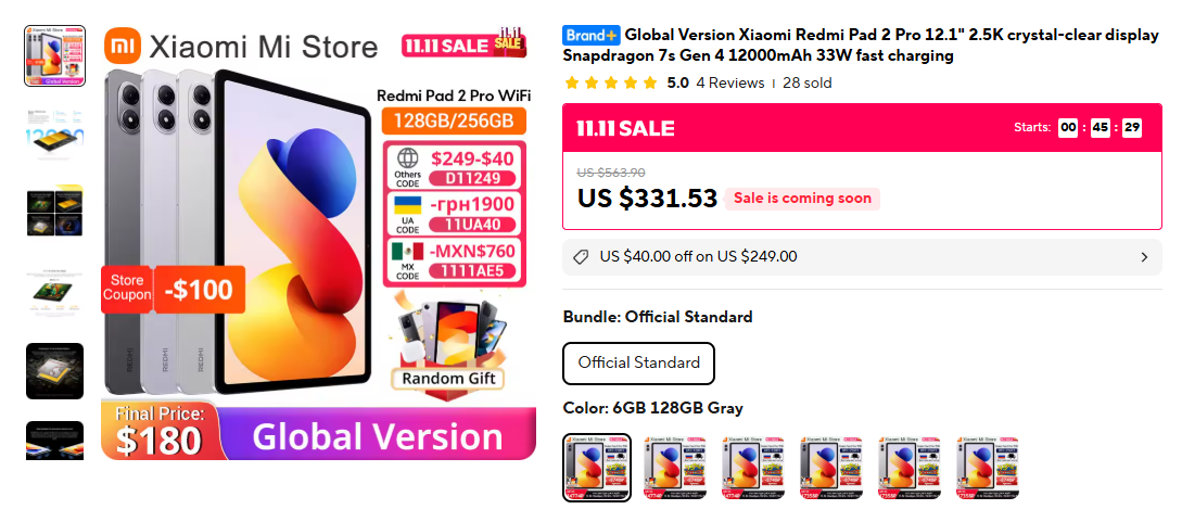 Xiaomi Redmi Pad 2 Proは、Qualcomm Snapdragon 7s Gen 4プロセッサ、6GBまたは8GB RAM、128GBまたは256GBストレージを積みます。12.1インチLCDは1600×2560解像度、120Hzリフレッシュレート、500nits輝度、Dolby Vision対応。バッテリー容量12000mAhで33W急速充電、フロント8MPリア8MPカメラ、クアッドスピーカー搭載。重量610g、Android 15ベースHyperOS。セール価格$267は参考$367から27%オフ、11.11-11.19のストアクーポンJPXM100適用。AliExpressポイントでさらに数%還元され、拡張microSD対応でストレージ不足を解消します。この構成で動画編集やブラウジングが快適に進み、家族共有にぴったりです。