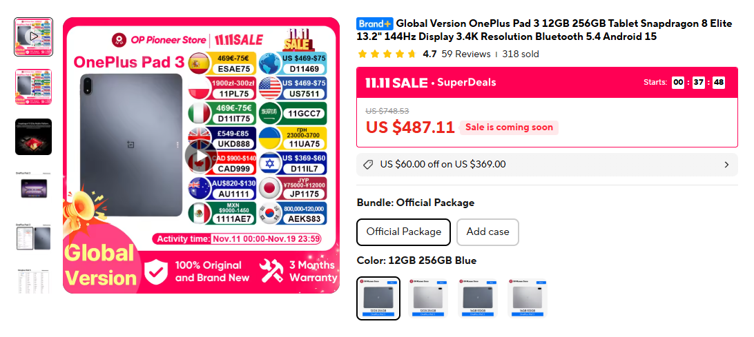 OnePlus Pad 3は、Qualcomm Snapdragon 8 Elite、12GBまたは16GB RAM、256GBまたは512GBストレージ搭載。13.2インチLCDは3400×2400解像度、144Hz、900nits、Dolby Vision。バッテリー12140mAh、80W急速充電、フロント8MPリア13MP、8スピーカー(4ウーファー+4ツイーター)。重量約600g、Android 15 OxygenOS。セール価格$499は参考$509から2%オフ、11.11-12.03ストアクーポンSALEBUYPAD3適用。ポイントで追加、UFS 4.0高速。このフラッグシップ級でプロ級エンタメと生産性が得られます。