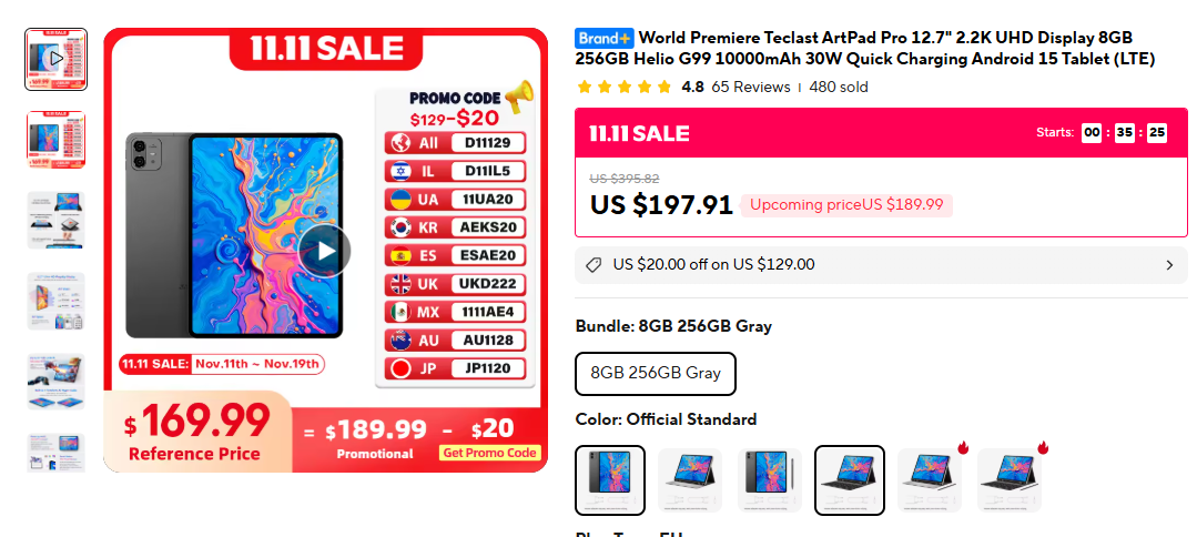 Teclast Artpad Proは、MediaTek Helio G99、8GB RAM(拡張12GB)、256GBストレージを備えます。12.7インチIPSは2176×1600解像度、60Hz、400nits、Widevine L1対応。バッテリー10000mAh、18W充電、フロント8MPリア13MP、デュアルスピーカー。重量675g、Android 15。セール価格$168は参考$178から6%オフ、11.11-12.03ストアクーポンTSJP10適用。ポイント還元でmicroSD拡張可能。この構成でドローイングやノート取りが手軽にこなせます。