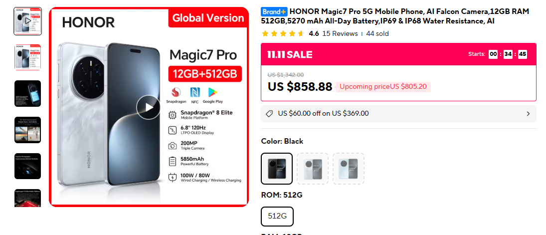 HONOR Magic7 Proは、Qualcomm Snapdragon 8 Elite、12GBまたは16GB RAM、256GBまたは1TBストレージ。6.8インチOLEDは1280×2800解像度、120Hz、5000nits、リア50MP(メインOIS)+50MP超広角+200MP望遠、フロント50MP。バッテリー5850mAh、100W有線/80W無線充電、IP68。重量223g、Android 15 MagicOS 9。セール価格$921は参考から微オフ、11.1-12.3ストアクーポンJPPOP05 $5適用。ポイント還元でUFS 4.0高速。このプロ級カメラでクリエイティブを極めます。