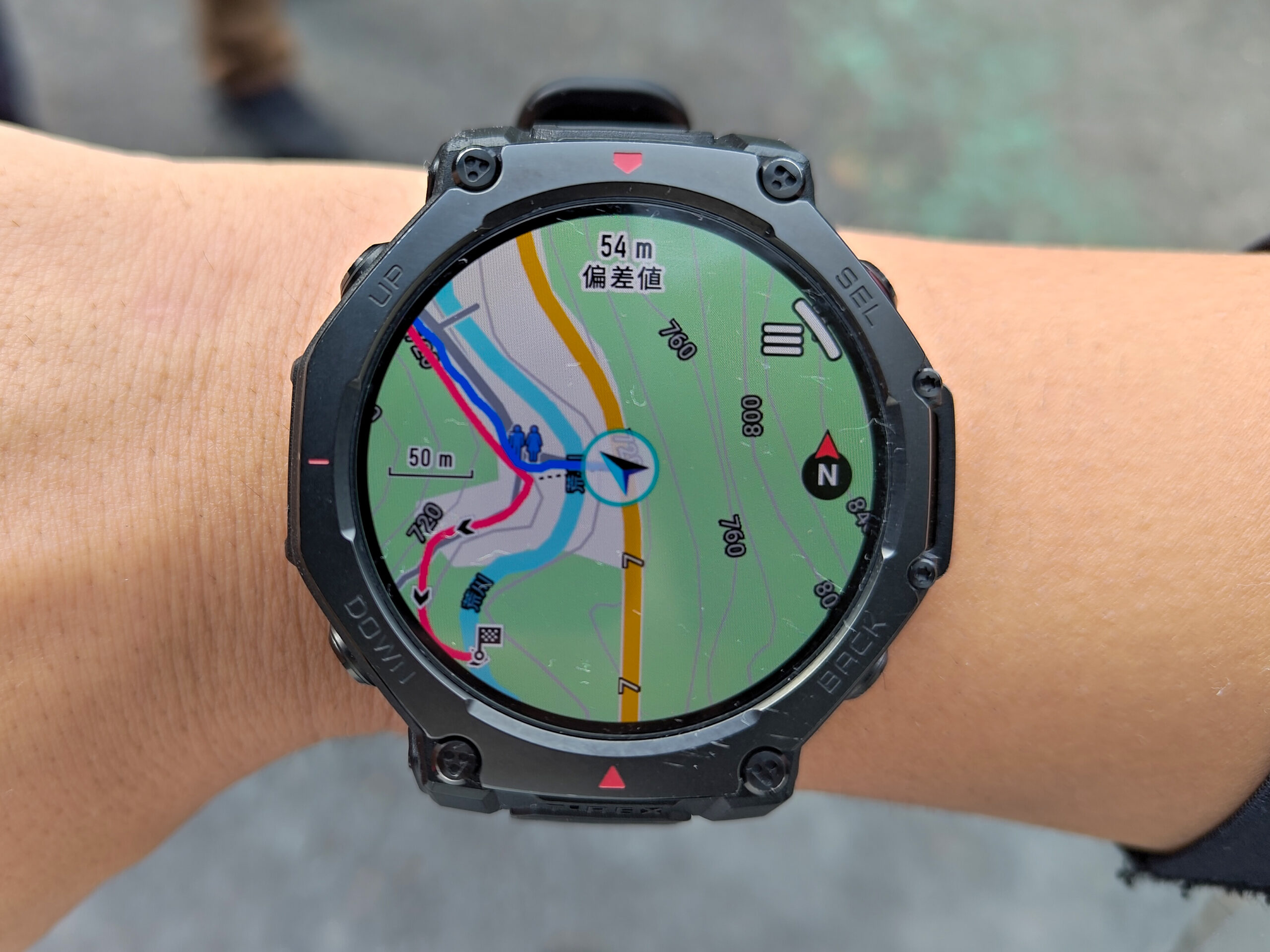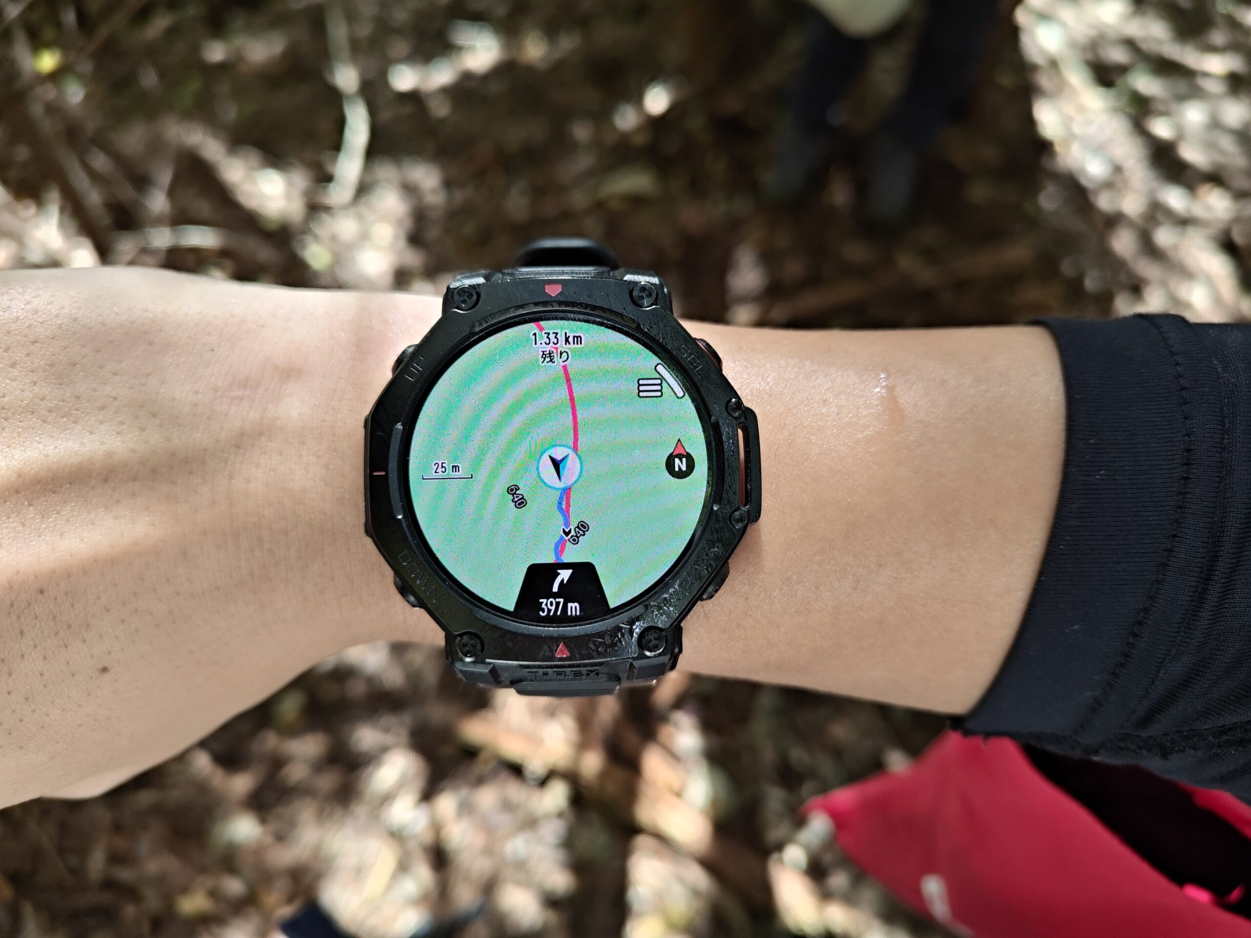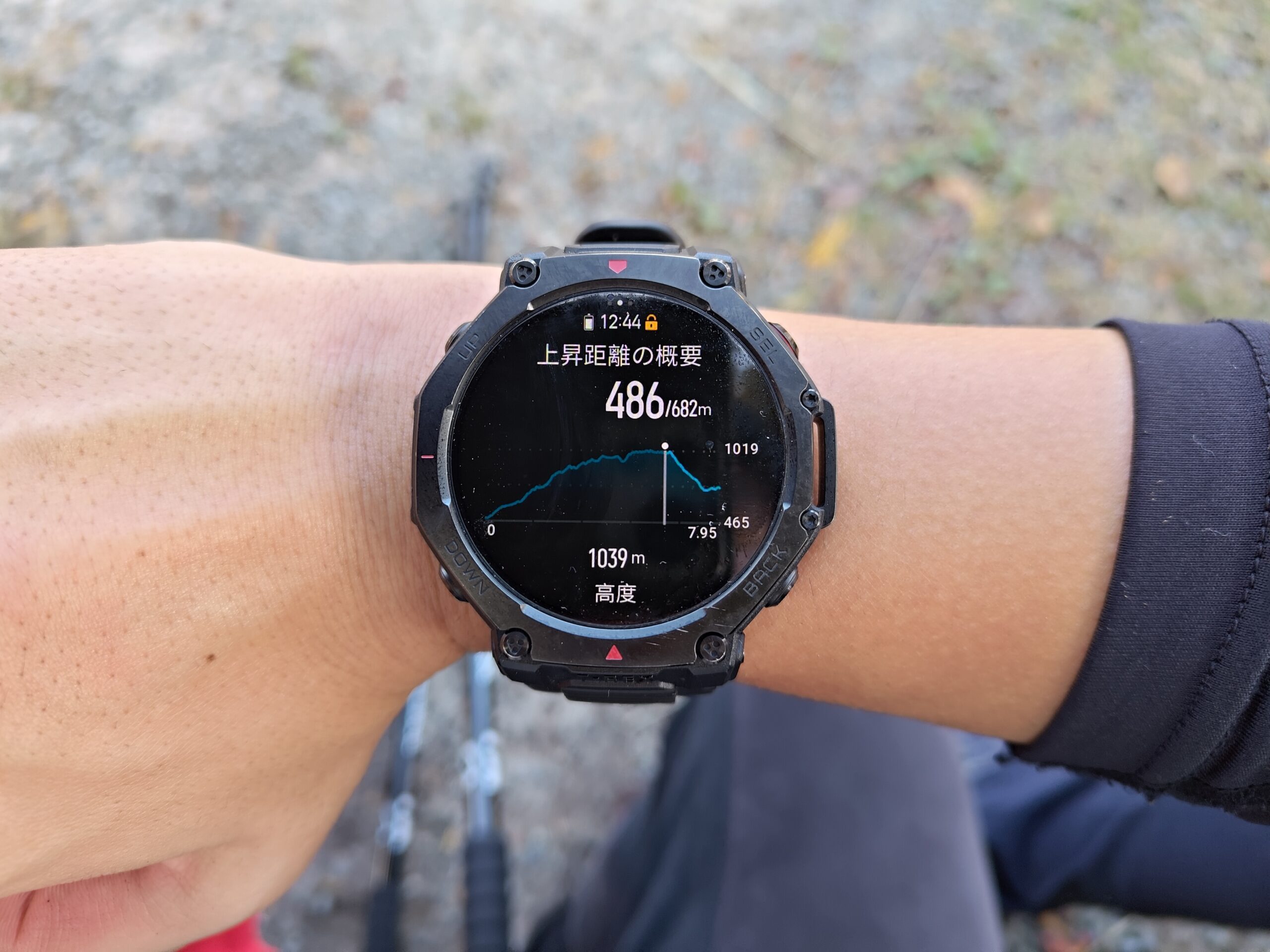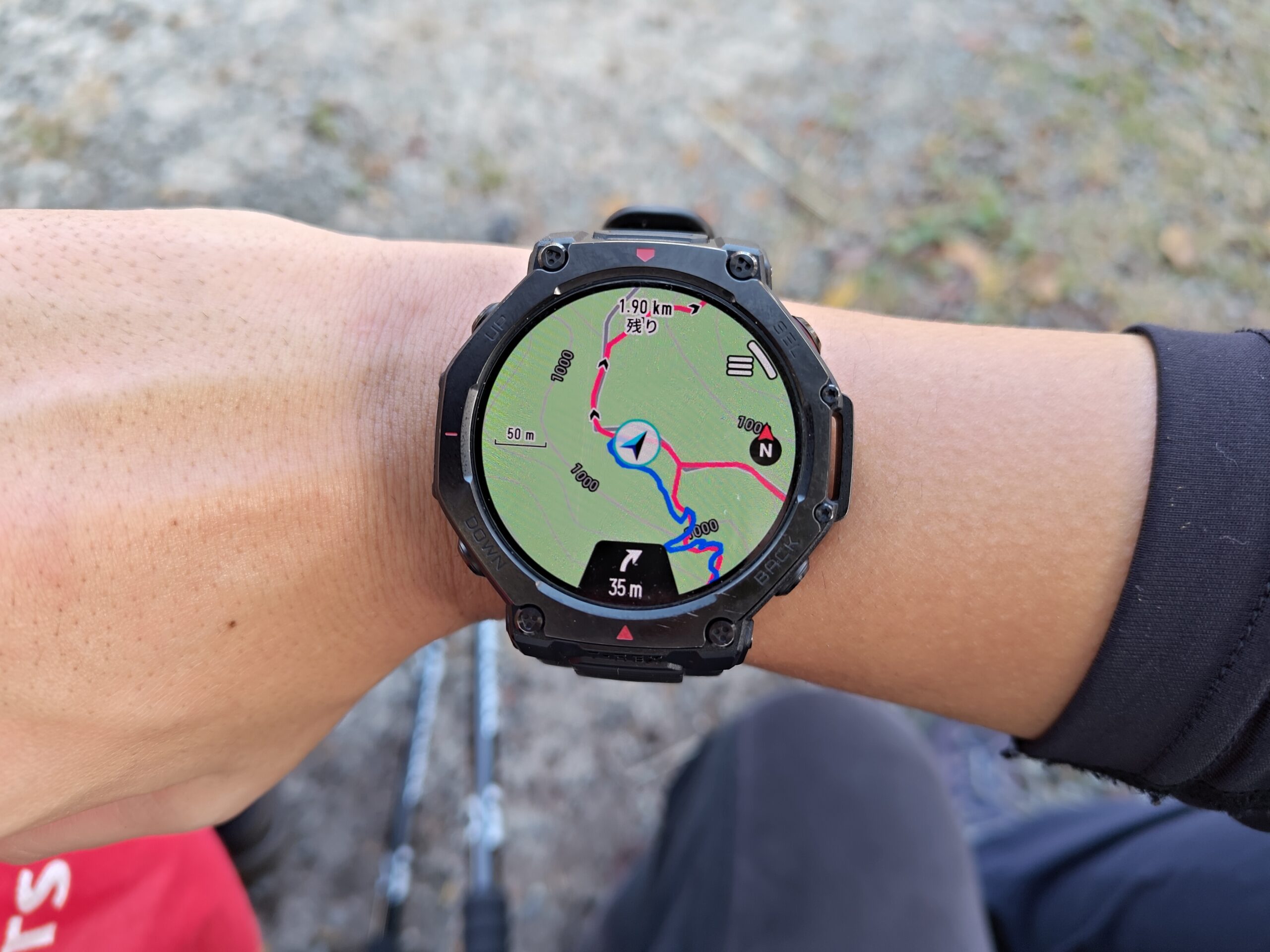 今回はヤマレコアプリのGPS機能も利用しながら登っていましたが、登山道を歩いている途中でいちいちスマートフォンを取り出してマップを確認したり、登山の状況を確認するのは面倒極まりないところ。歩きづらい登山道でスマホを凝視したら転んでしまうリスクも、スマホを落とすリスクもあります。対してAmazfit T-Rex 3 Proの画面ならすぐに確認でき、腕に巻き付いているので落とす心配がないのも安心でした。