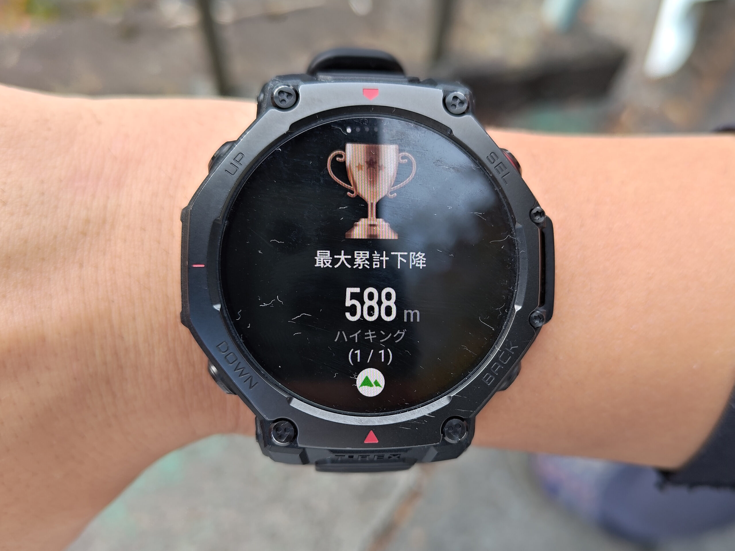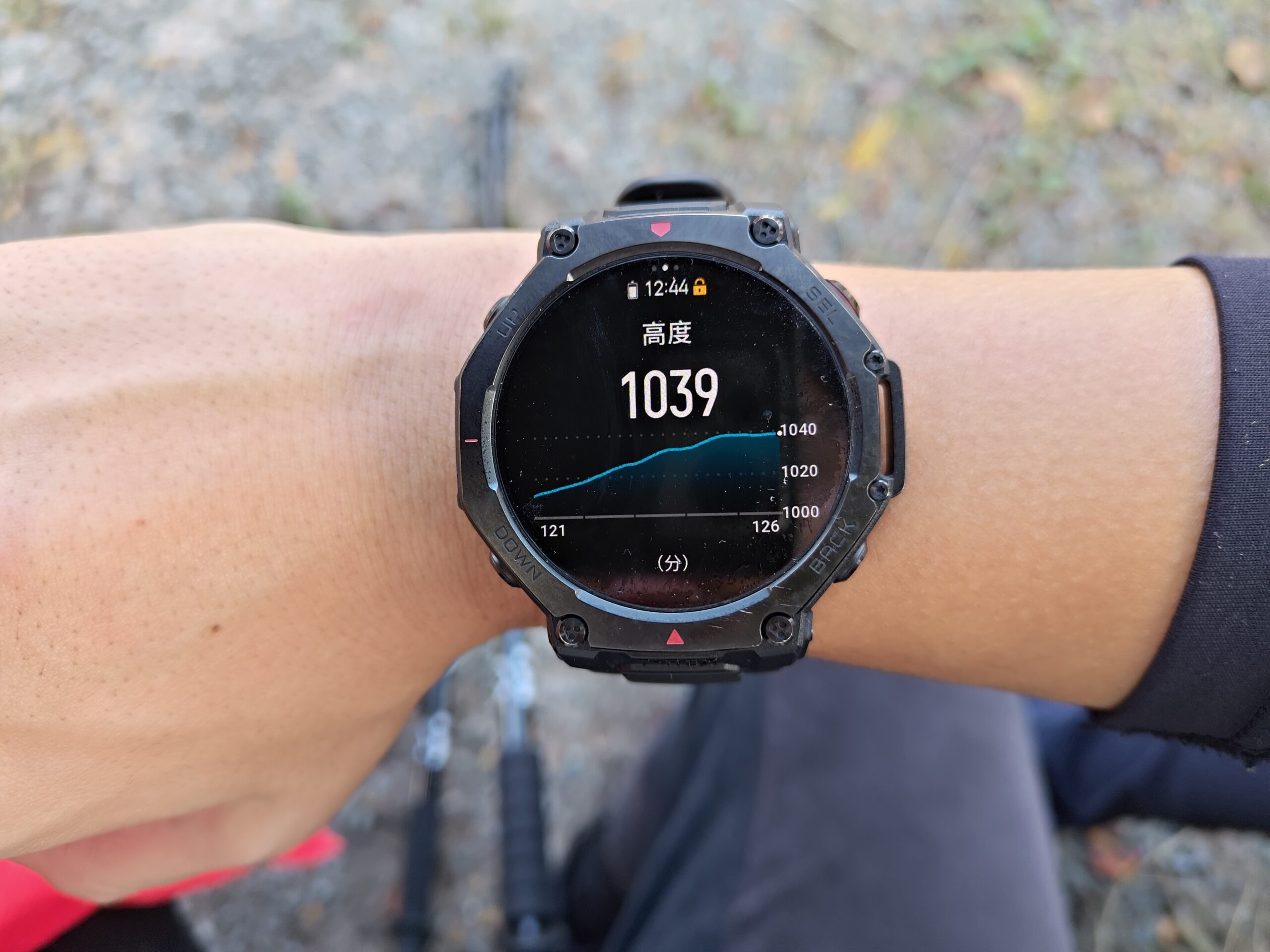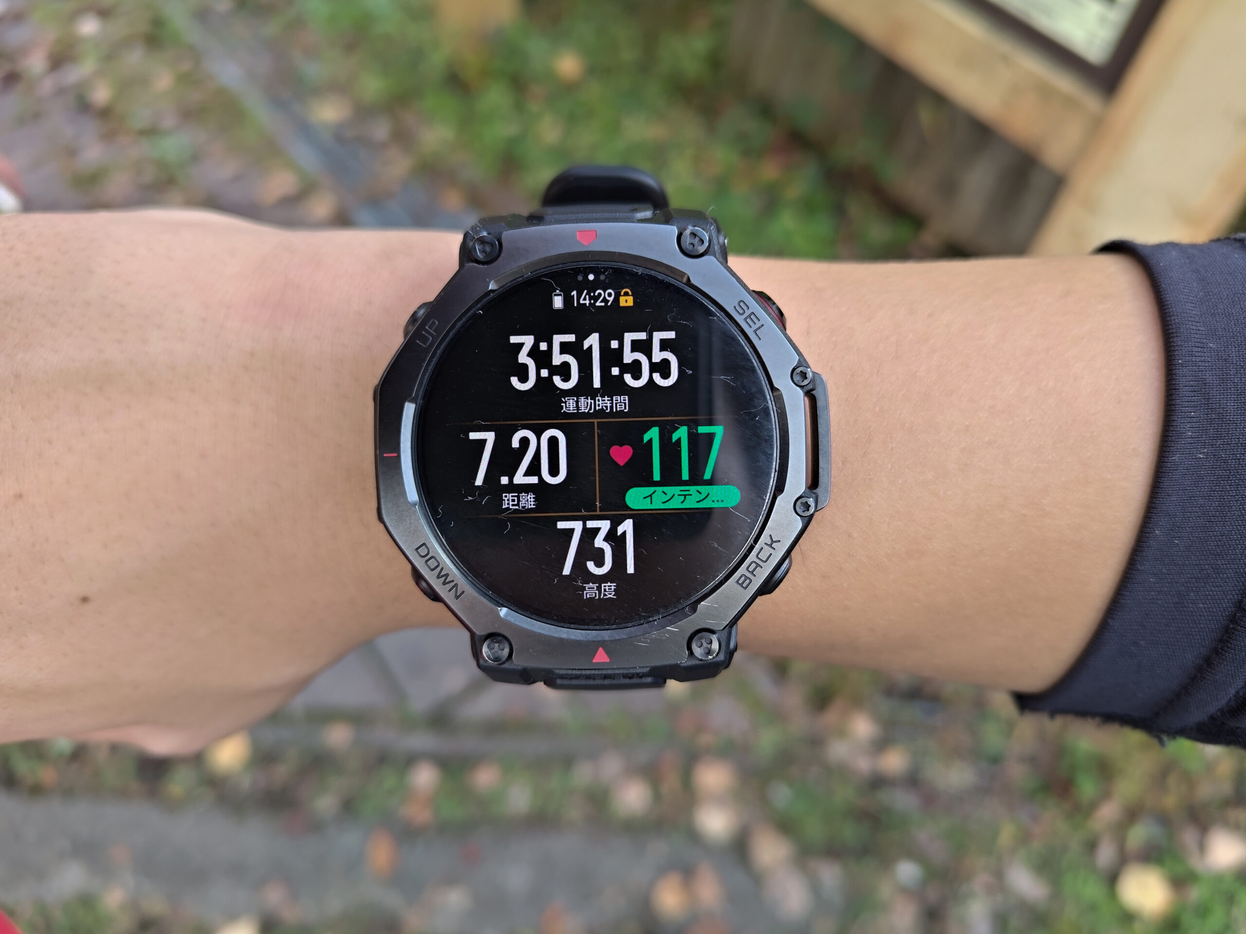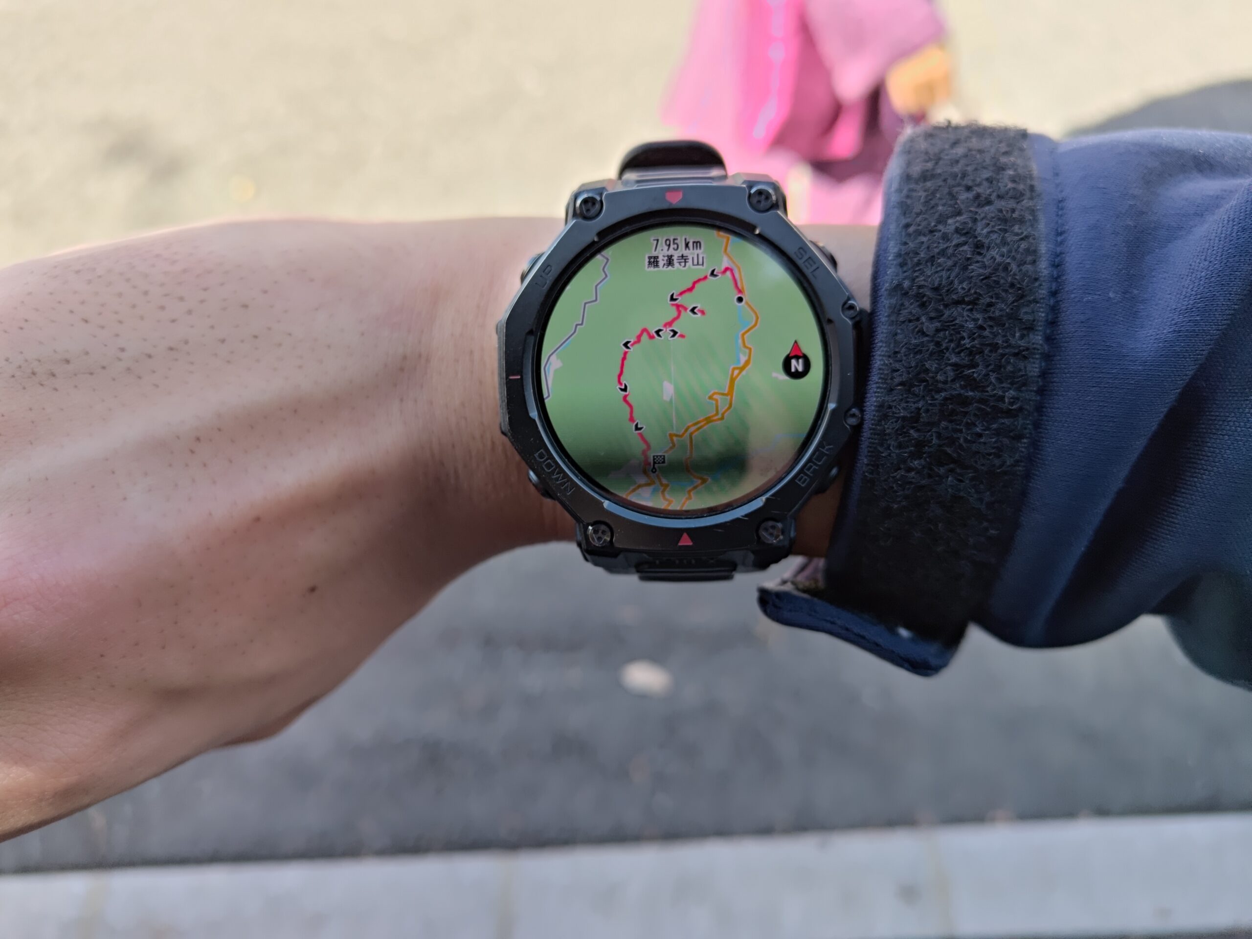 今回はヤマレコアプリのGPS機能も利用しながら登っていましたが、登山道を歩いている途中でいちいちスマートフォンを取り出してマップを確認したり、登山の状況を確認するのは面倒極まりないところ。歩きづらい登山道でスマホを凝視したら転んでしまうリスクも、スマホを落とすリスクもあります。対してAmazfit T-Rex 3 Proの画面ならすぐに確認でき、腕に巻き付いているので落とす心配がないのも安心でした。
