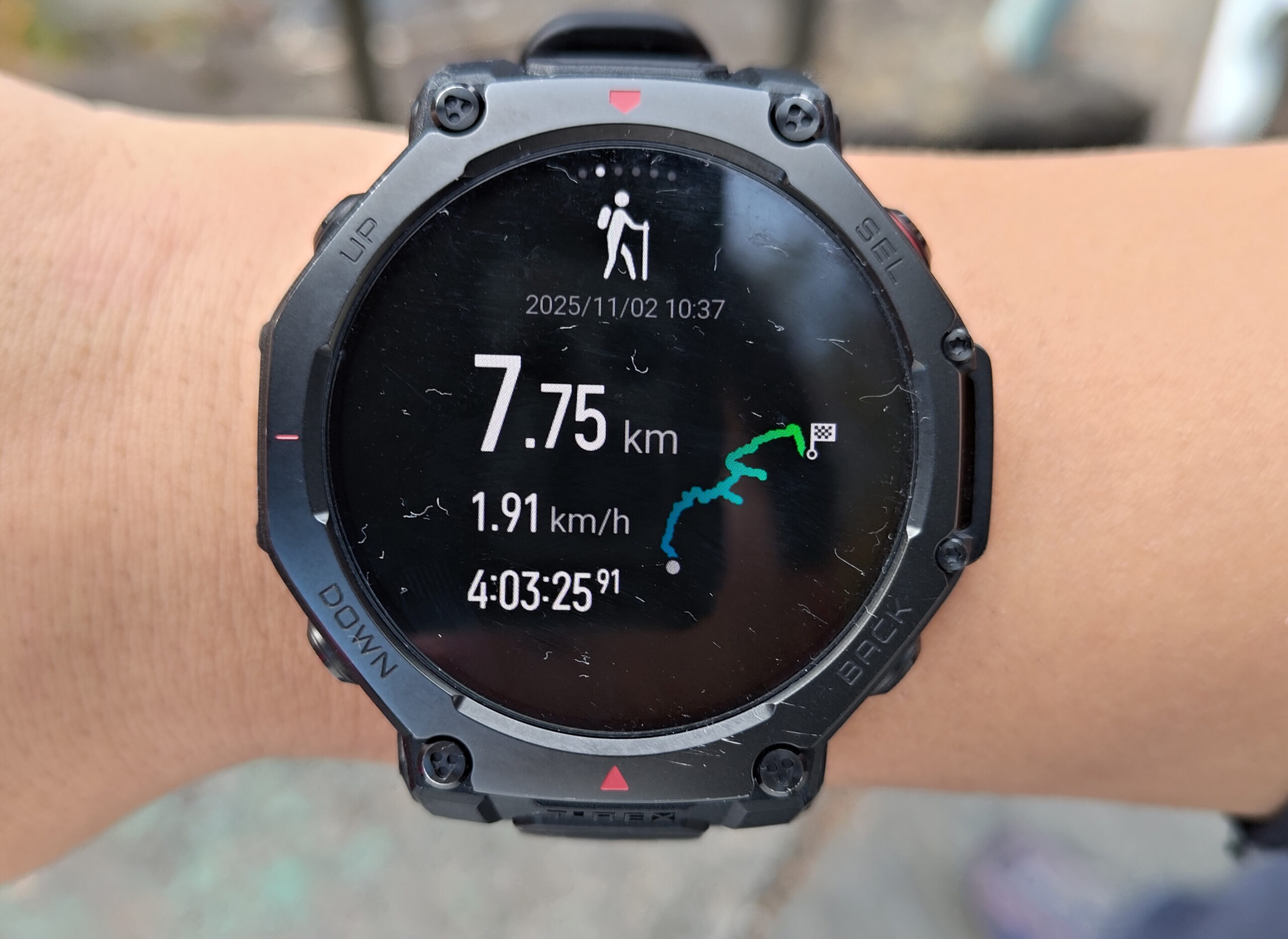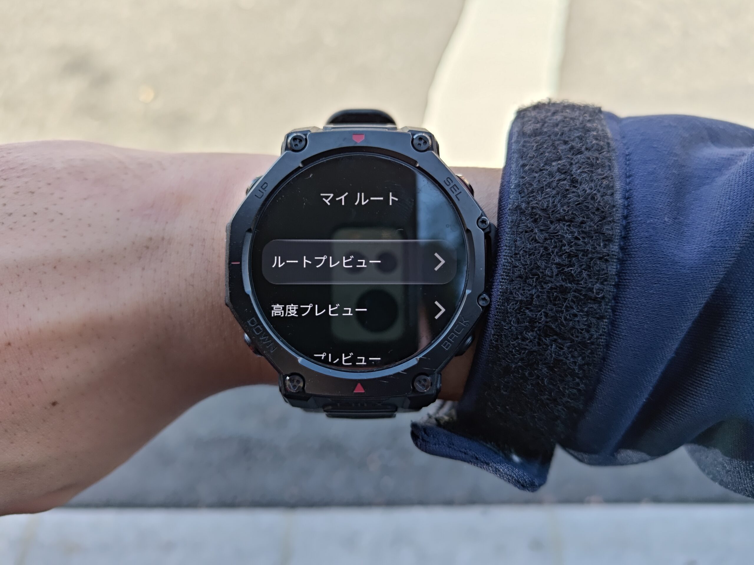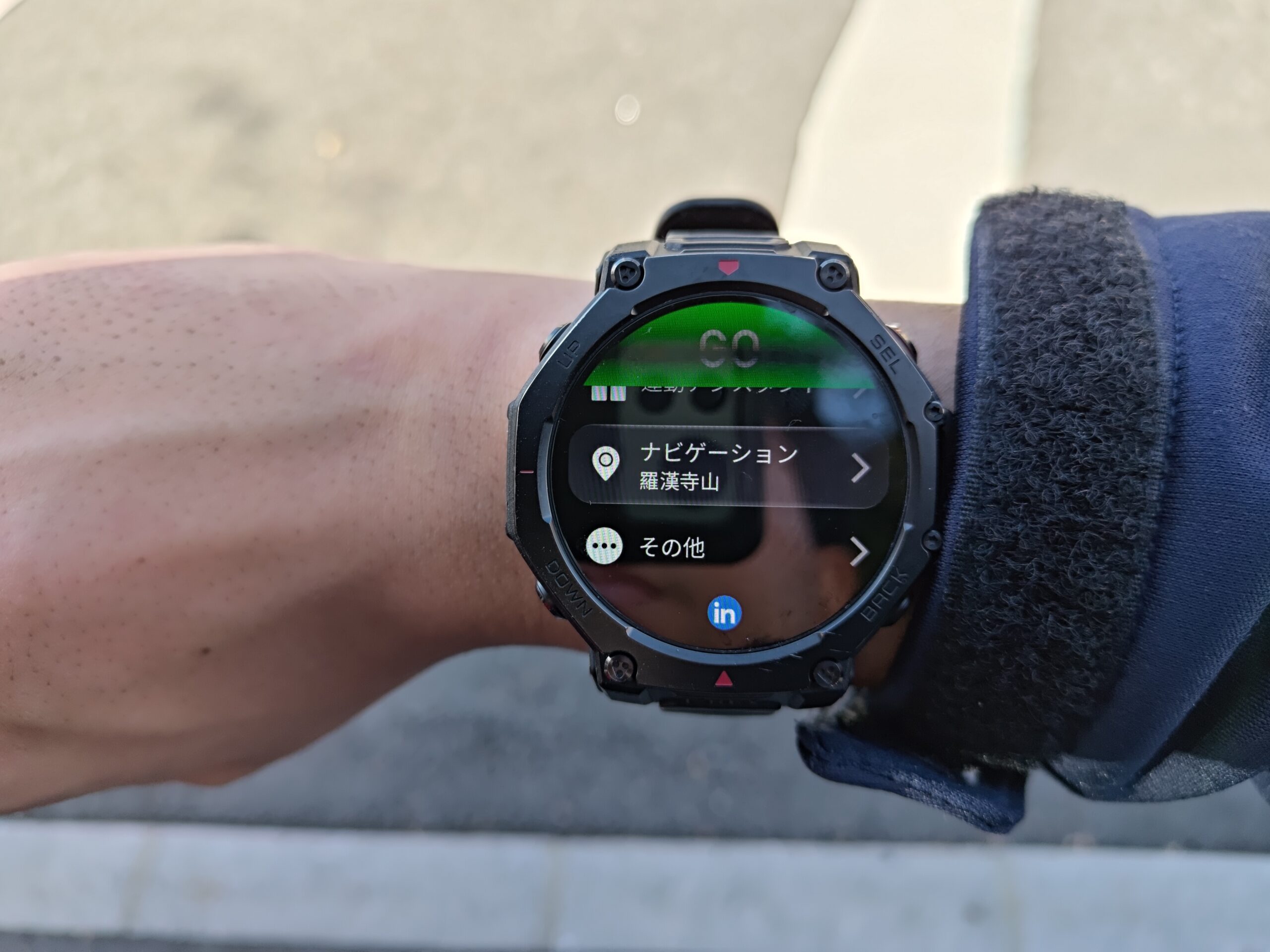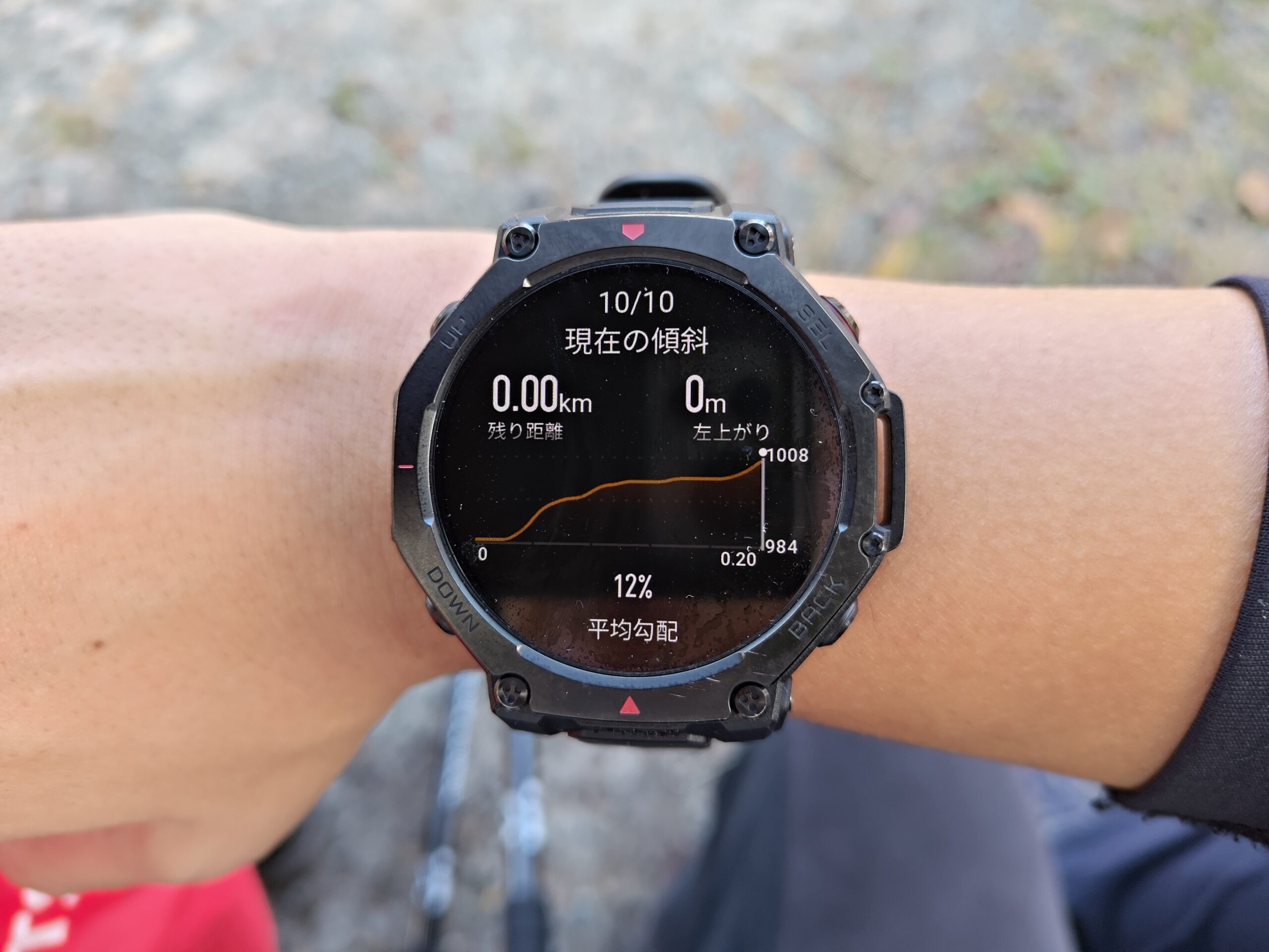 今回はヤマレコアプリのGPS機能も利用しながら登っていましたが、登山道を歩いている途中でいちいちスマートフォンを取り出してマップを確認したり、登山の状況を確認するのは面倒極まりないところ。歩きづらい登山道でスマホを凝視したら転んでしまうリスクも、スマホを落とすリスクもあります。対してAmazfit T-Rex 3 Proの画面ならすぐに確認でき、腕に巻き付いているので落とす心配がないのも安心でした。