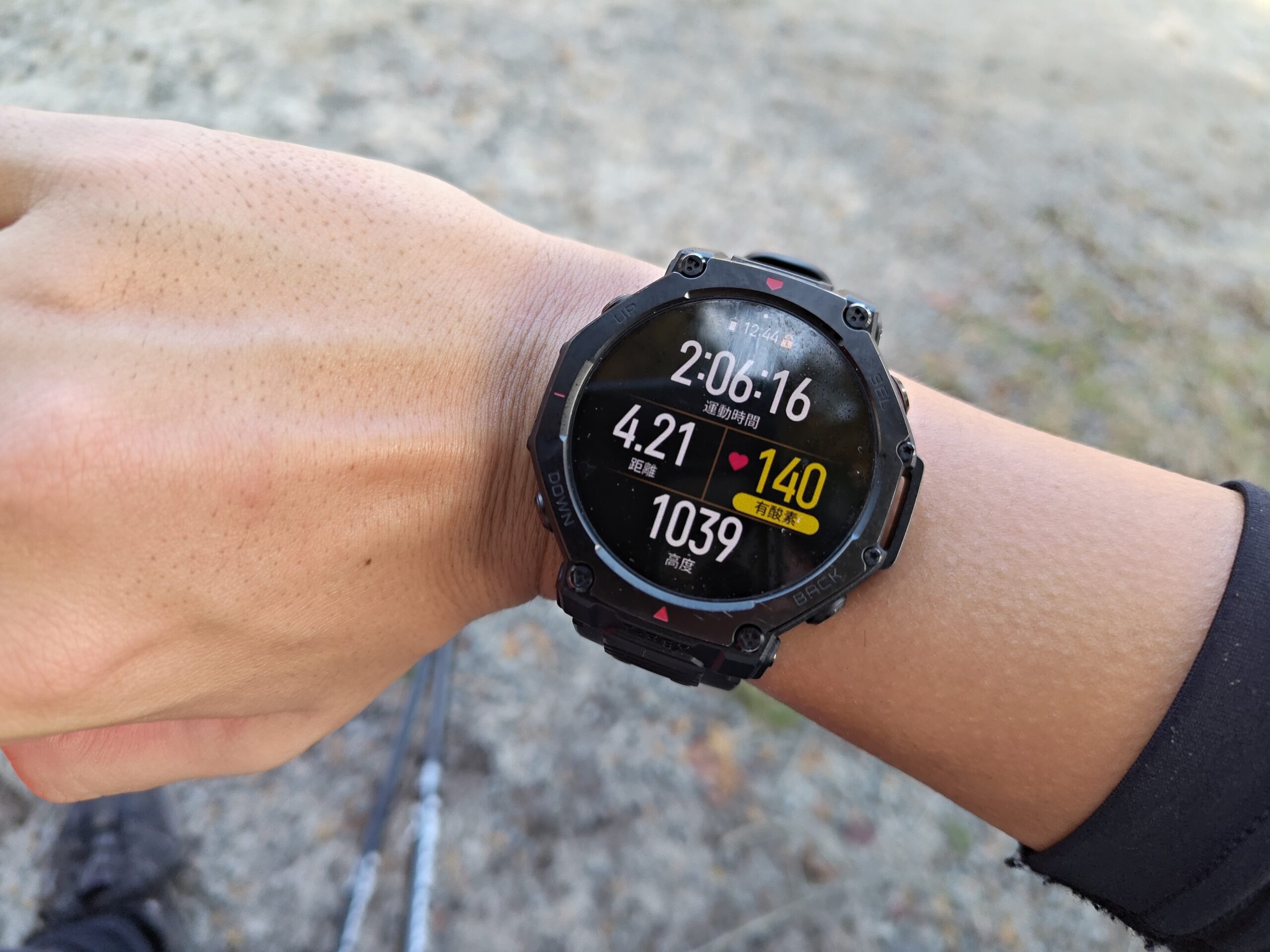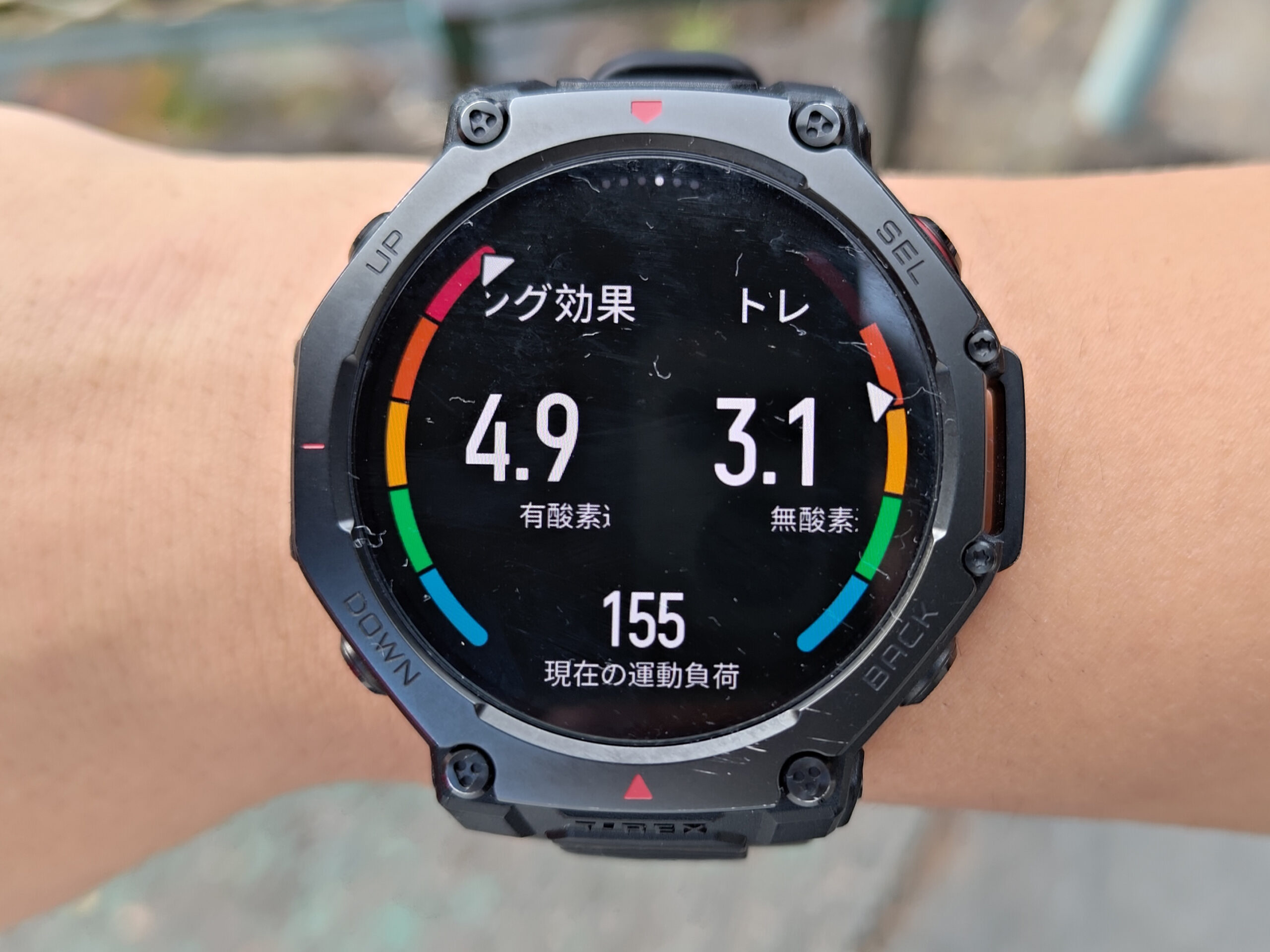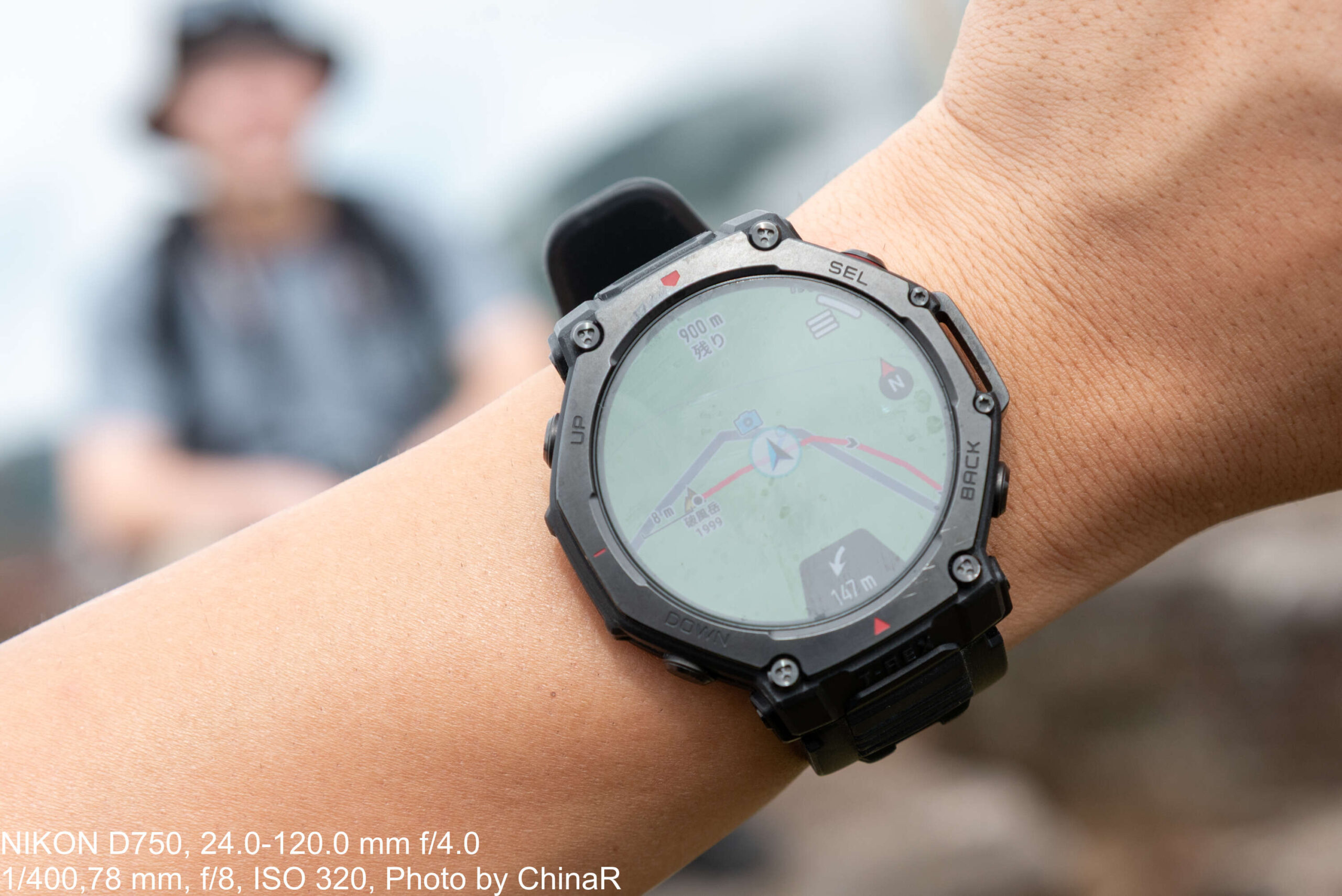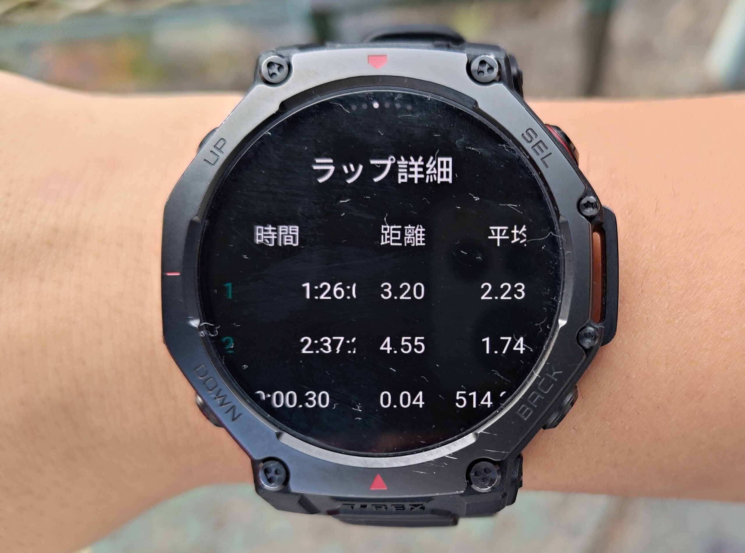 今回はヤマレコアプリのGPS機能も利用しながら登っていましたが、登山道を歩いている途中でいちいちスマートフォンを取り出してマップを確認したり、登山の状況を確認するのは面倒極まりないところ。歩きづらい登山道でスマホを凝視したら転んでしまうリスクも、スマホを落とすリスクもあります。対してAmazfit T-Rex 3 Proの画面ならすぐに確認でき、腕に巻き付いているので落とす心配がないのも安心でした。