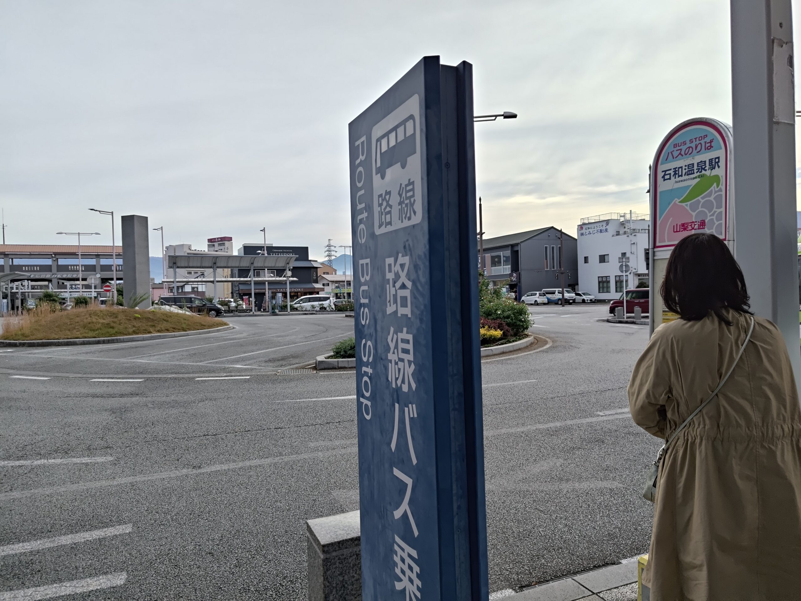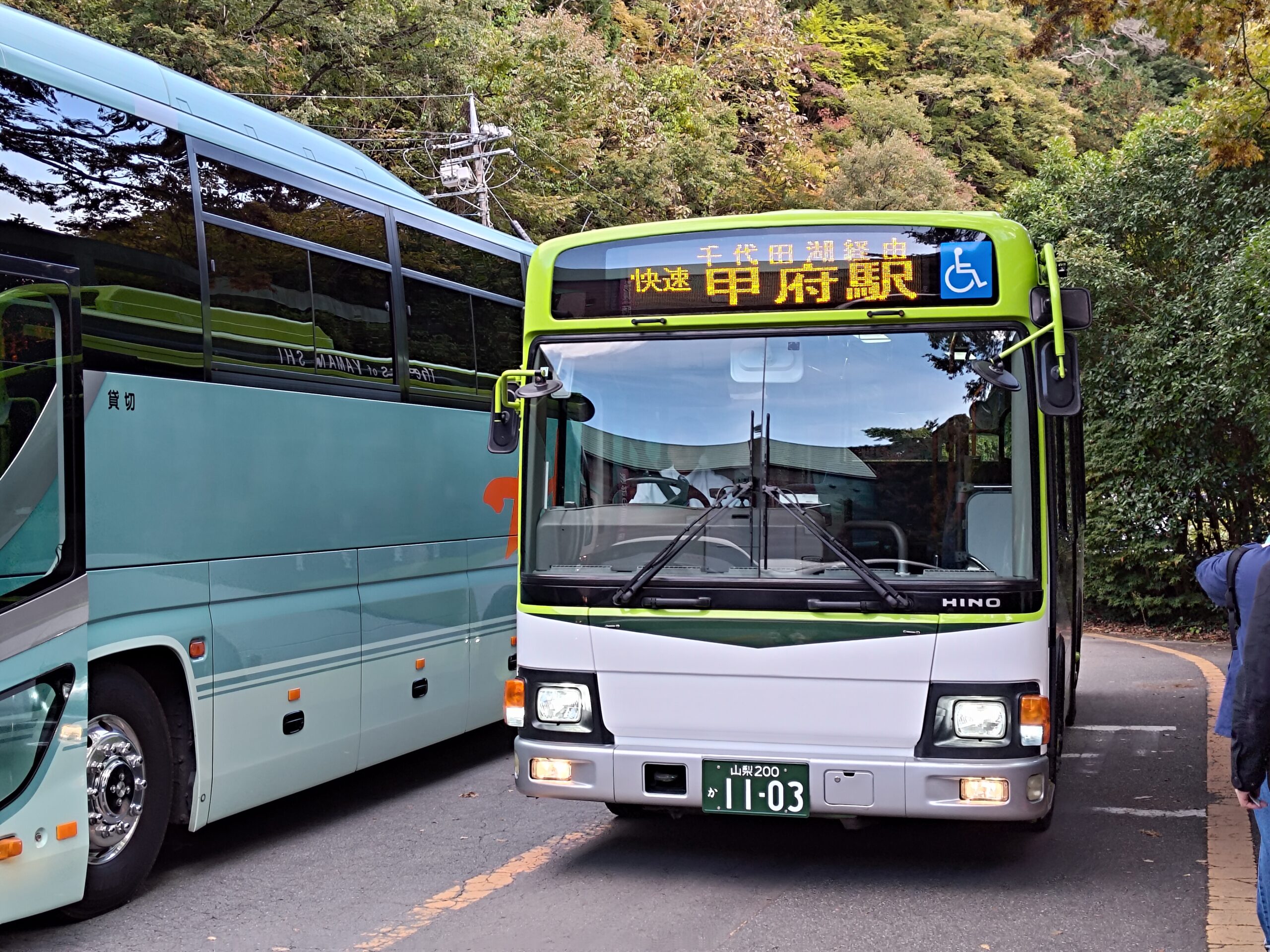 マップのダウンロードが完了したら準備完了です。秋の羅漢寺山を目指して新宿駅から特急あずさで出発します。羅漢寺山に向けては、石和温泉駅から山梨交通の昇仙峡行きの快速バスを利用するのがベター。甲府駅からも乗車できますがハイシーズンはかなり混雑するため、始発の石和温泉駅から乗車すると着席を狙うことができます。