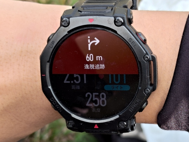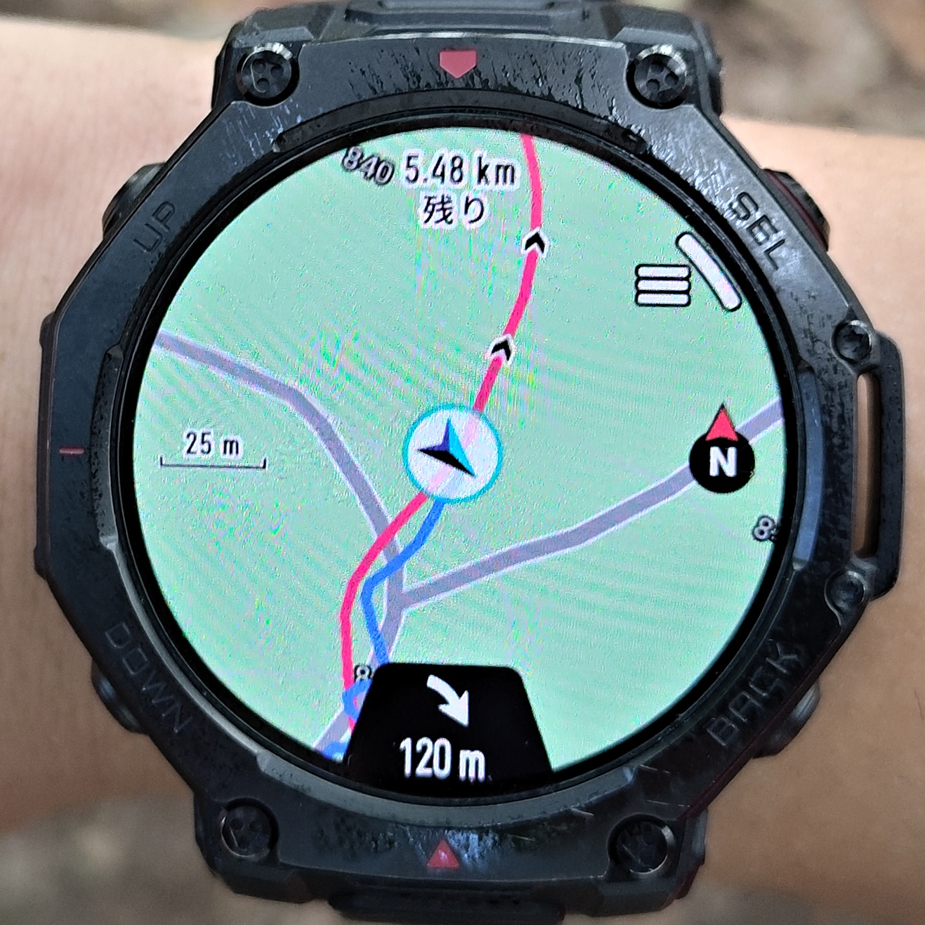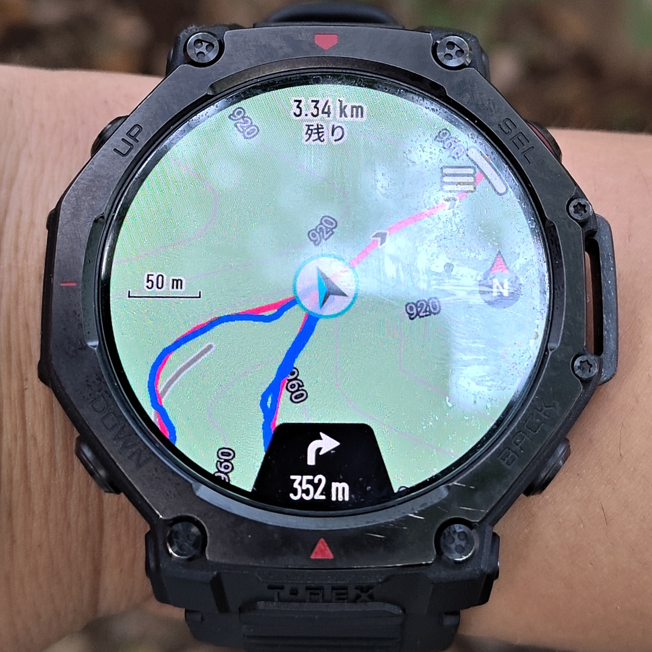 なお、GPSの誤差なのか、それとも単純に地図が誤っていたのかは分かりませんが、登山道中で少し迷うような分岐があった際にヤマレコアプリ、T-Rex 3 Proの地図を確認しても絶妙にどちらが正しいのか判断がつかず間違ってしまう場面がありました。おそらく地図側の表記が実際の登山道に比べて大雑把な印象で、少し進んでみてマップ上で正しいかどうかを確認すると良さそうです。Amazfit T-Rex 3 Proなら一定距離逸脱したとき(20m/50m/100mで設定可能)に警告を発出することもできるので、それを設定しておくのもベターです(デフォルトは50mで設定)。