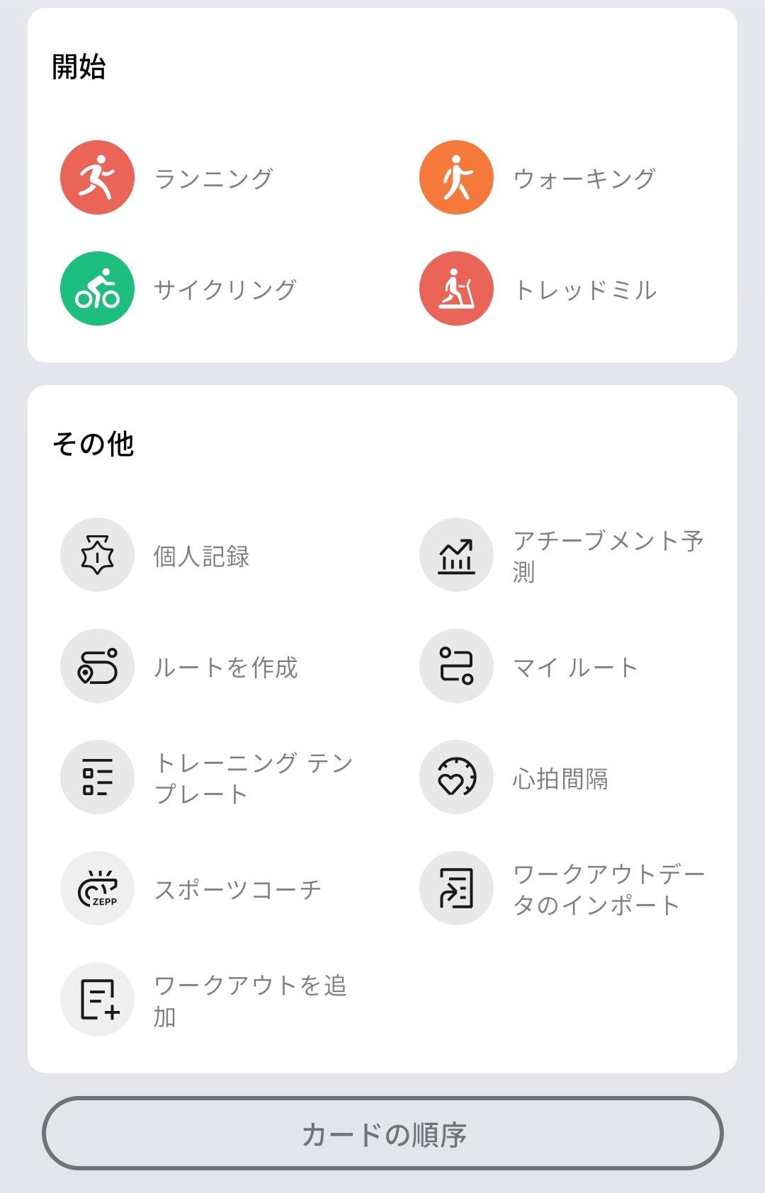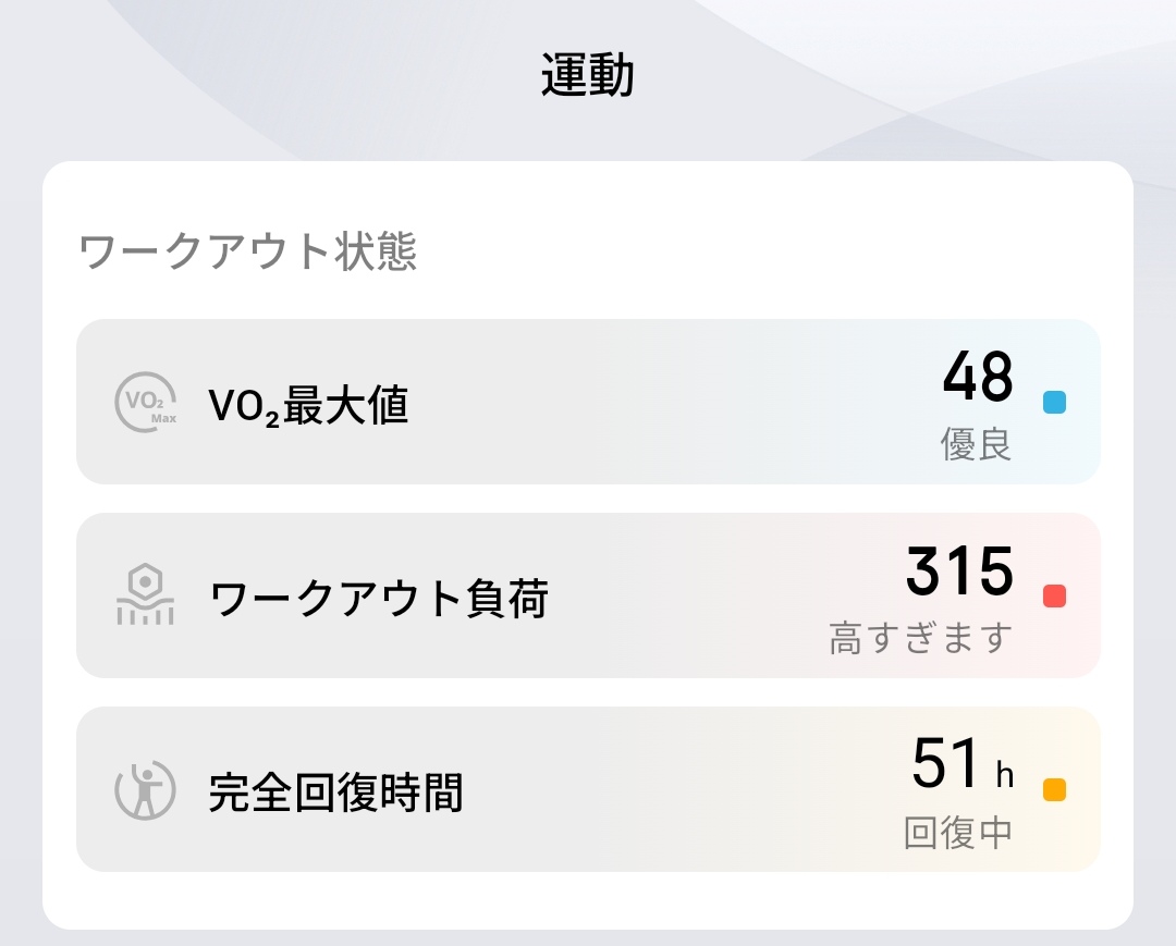 運動の成果に関してはZeppアプリの”運動”タブでも確認が可能。最大酸素摂取量であるVO2 MAXの状態や、直近のワークアウト負荷の状況、体が次のアクティビティに向けてどれだけ回復するべきかの”完全回復時間”も表示してくれます。これを見ながら、どれだけ体を休ませておくか、というのの指標にしておくと良いかなと。
