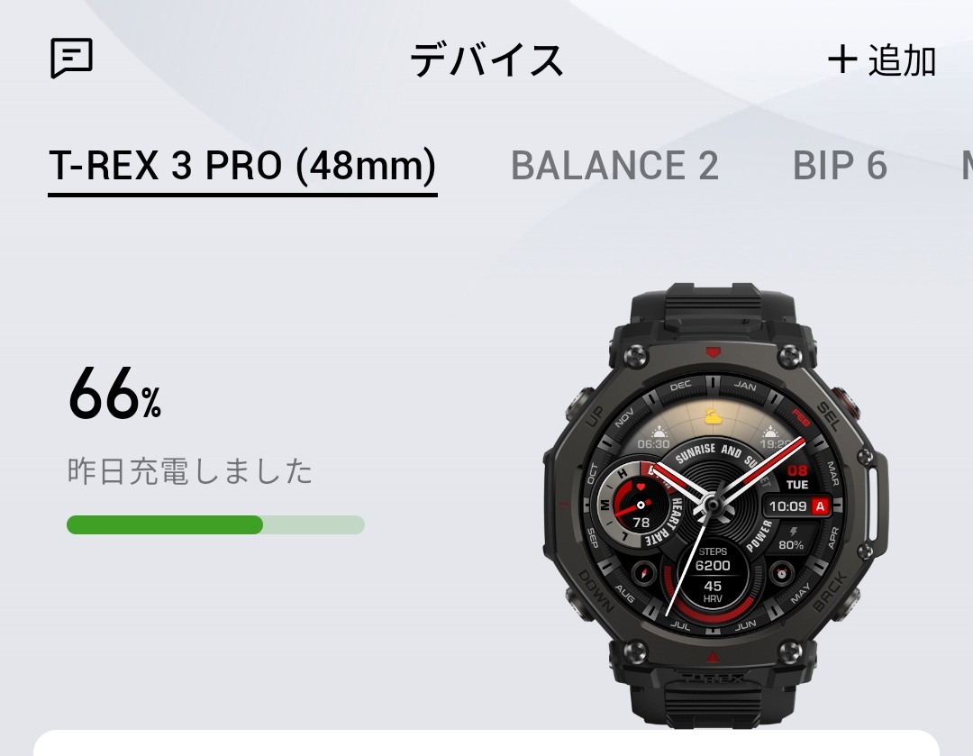 今回は登山中合計すると5時間ほどAmazfit T-Rex 3 ProではGPS機能を利用して、ルート上の位置を確認したり、運動状況を記録するのに活躍。また、基本的に常にマップを表示して使っていたため、5時間はぶっ通しでT-Rex 3 Proのフル機能を使っていたことになります。朝5時に家を出て帰宅して充電残量を見るとなんと66%。34%しかバッテリーを利用していませんでした。