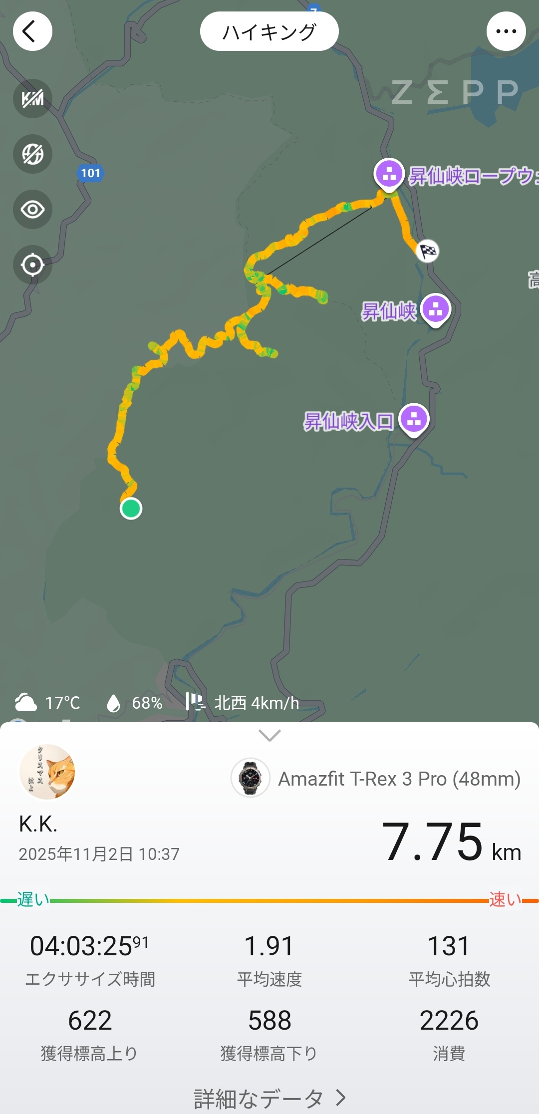 Amazfit T-Rex 3 Proで計測が完了したデータは、自動的にスマートフォンのZeppアプリに転送。エクササイズ時間や平均速度、平均心拍数、登った標高、降りた標高、そして消費したカロリーをダッシュボード上に表示してくれます。”詳細なデータ”からベストペースや、最大速度、歩数、最高標高や平均勾配、トレーニング負荷などの情報も表示してくれます。