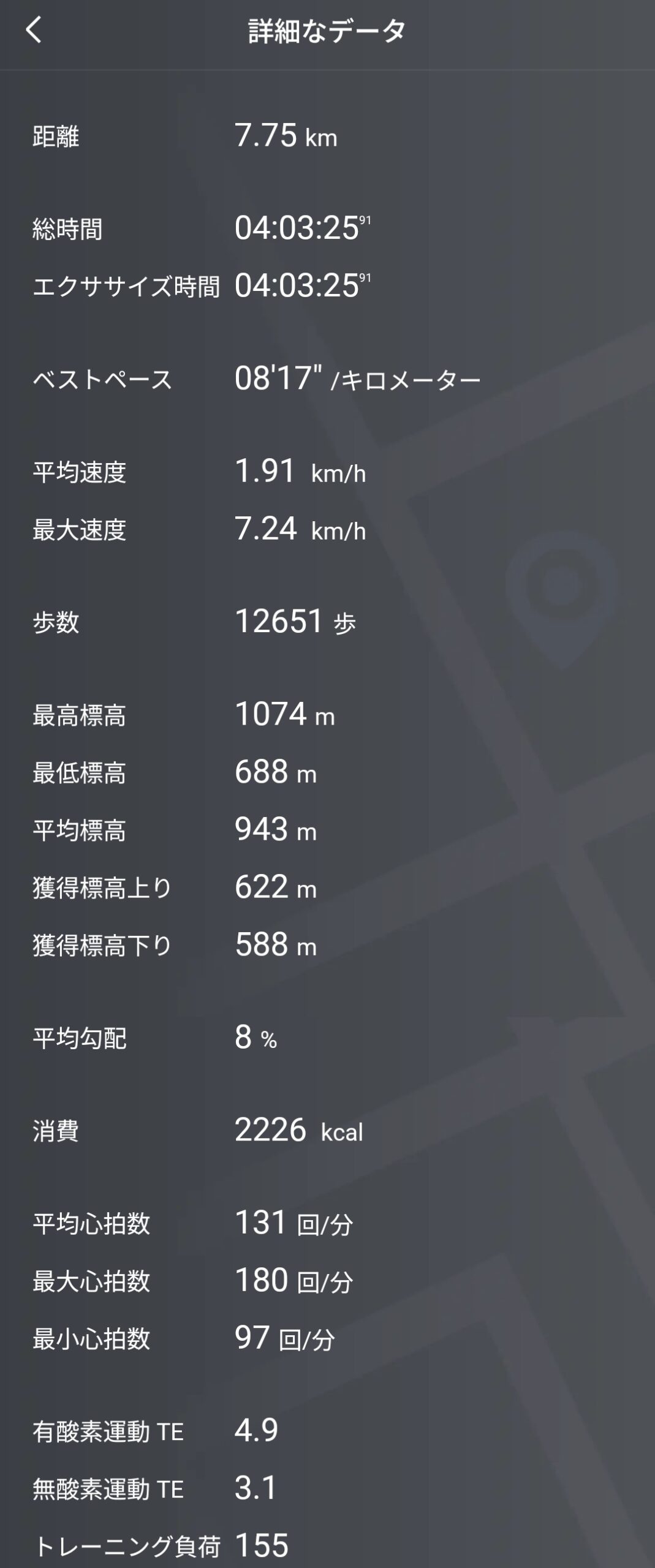 下山が完了してAmazfit T-Rex 3 Pro側の計測を止めれば、過去の自身の記録と照らし合わせて最大の結果があればこれも表示されます。あとは、実際に歩いた距離やペース、時間、ラップ詳細、トレーニング効果も表示。登山はずっと歩いているだけのように思えますが、上り坂が多いことやそもそも時間が長いこともあってトレーニング効果は高くなっています。