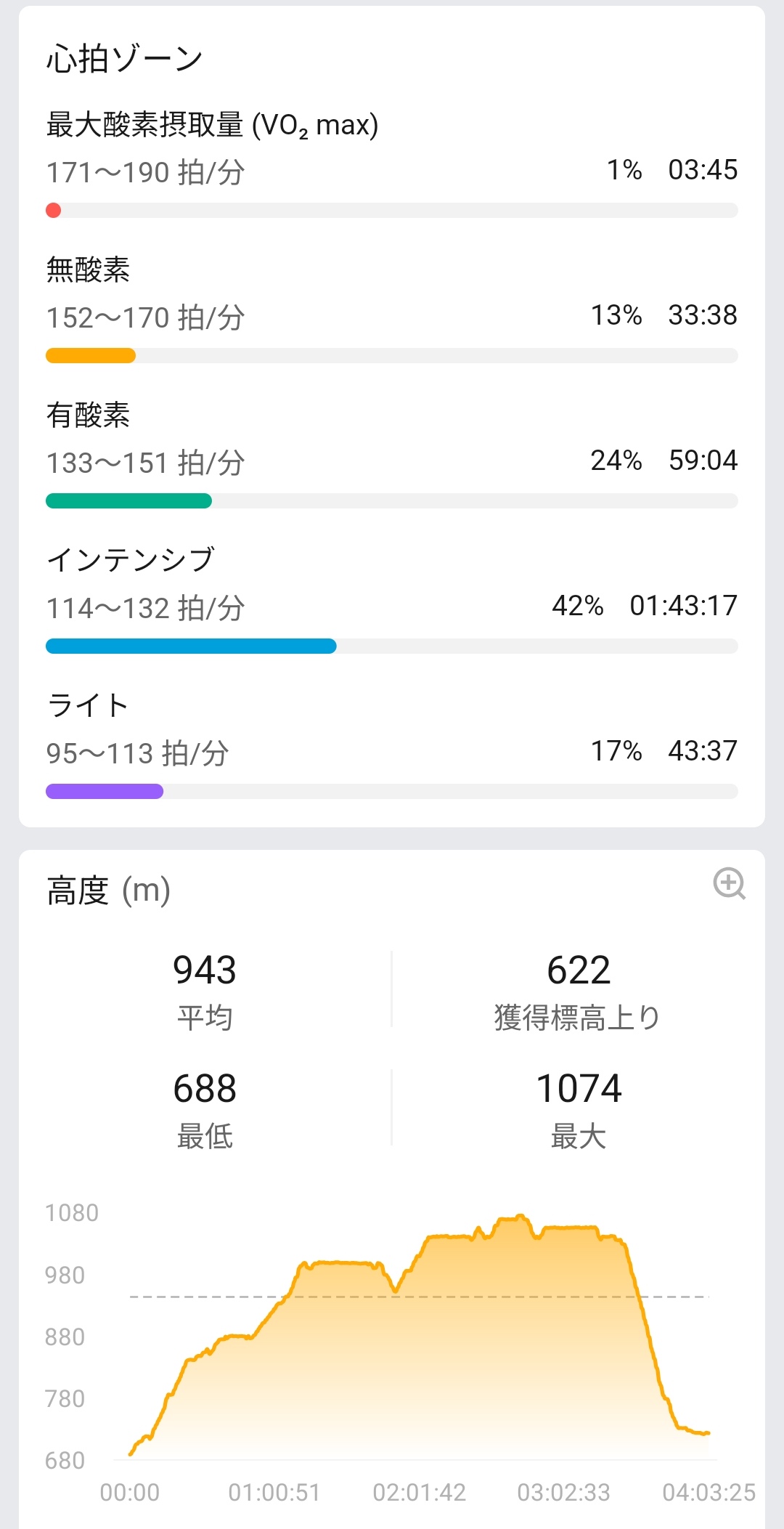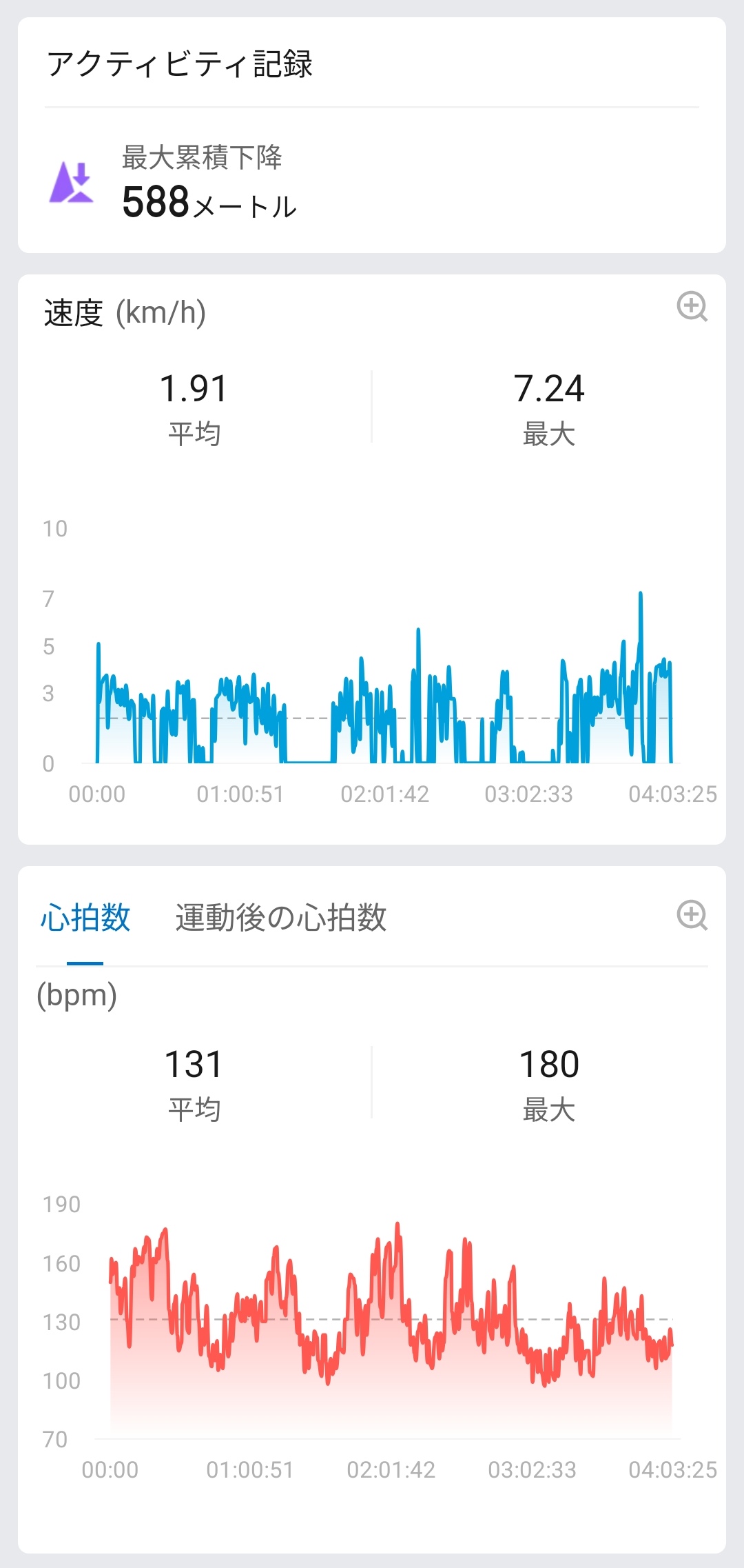 データを更に見ていくと速度や心拍数の遷移についてもグラフで表示。心拍ゾーンを見てみると無酸素(152~170)が33分(13%)、有酸素(133~151)が59分(24%)と相当な部分を占めていることもわかるかと。下山は一気に駆け下りるような下り方をしているため高度グラフがストンと落ちているようになっているのも面白いところでした。