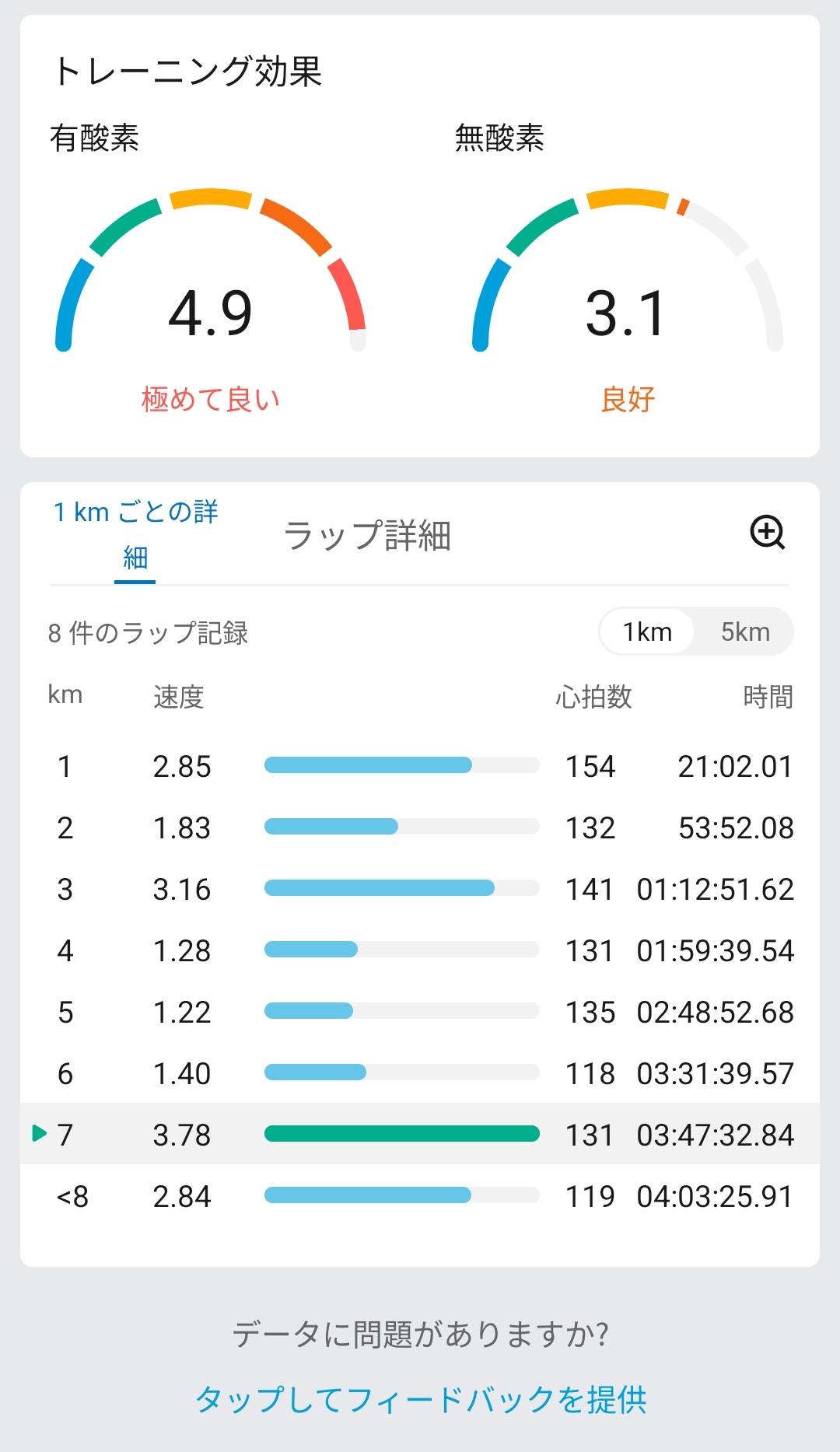 トレーニング効果に関してもグラフ化して表示。有酸素に関しては”極めて良い”となっており、無酸素に関しても”良好”という結果に。1kmごとの時間、速度も表示されており、どれだけのペースだったのかというのも振り返る事が可能です。