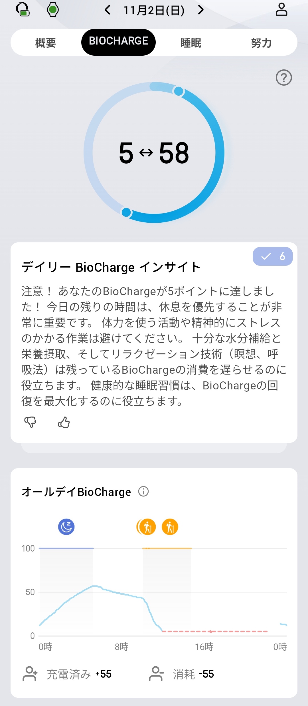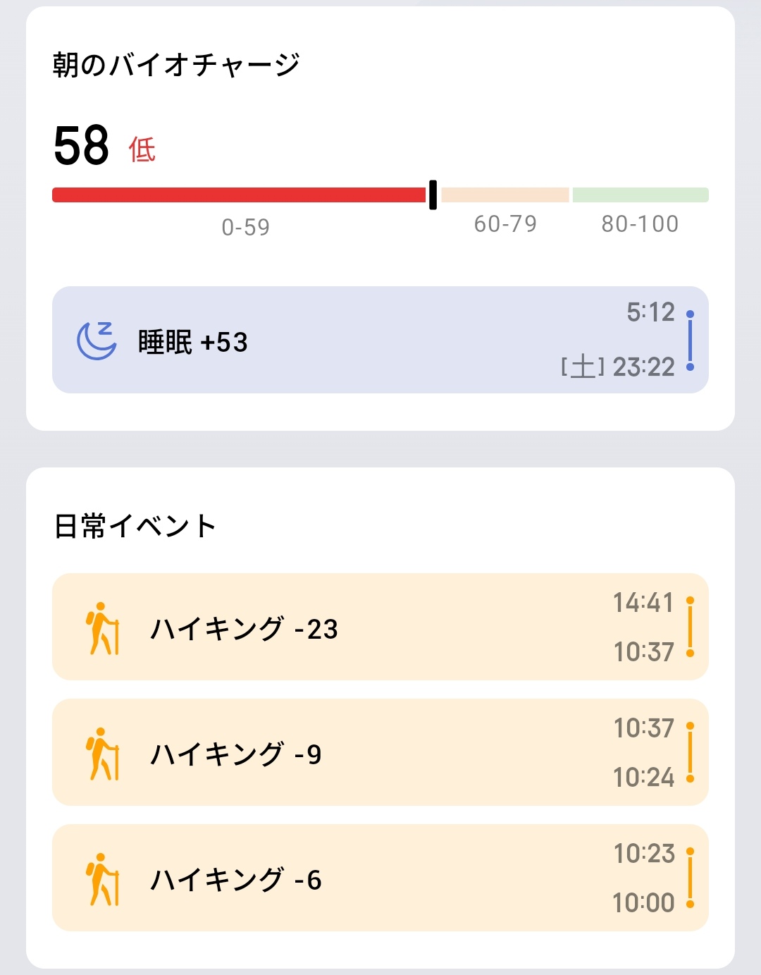 BioChargeタブを見ると、登山で一気にBioChargeを使い果たしている様子。朝出発するのが早かったことや、この一週間睡眠時間がそこまで取れていなかったこともあり朝起床時点でのBioChargeが低かったのもありますが、体が一気に疲れる山登りだったというわけです。