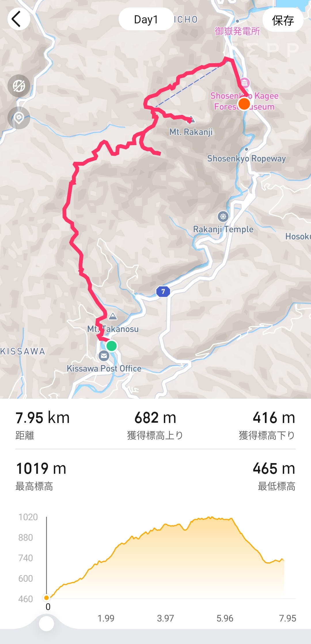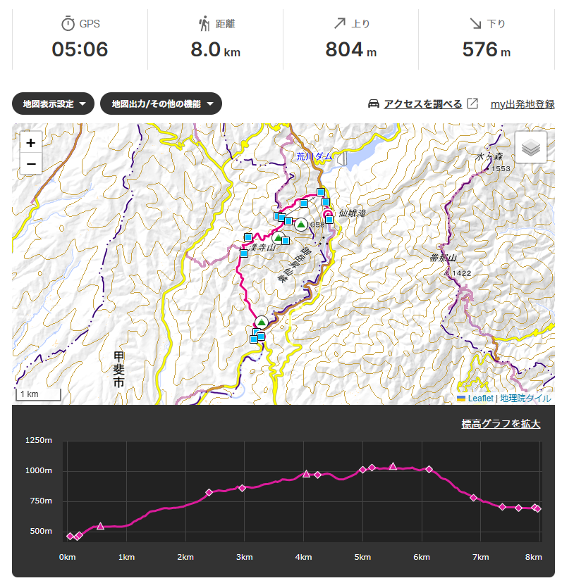 今回は周遊ルートで登山をしたこともあり、下山してバス停に着くまでをルートに取り込んでいました。最後のバス停の場所はヤマレコ側のデータが間違っていたため画像のようにルートから逸脱していますが、どんどん下っていく様子についても記録することができました。パノラマ台側には山麓から山頂までを一気に登れる昇仙峡ロープウェイがありますが、下山にも使わずトレイルコースを一気に駆け下りて来ました。