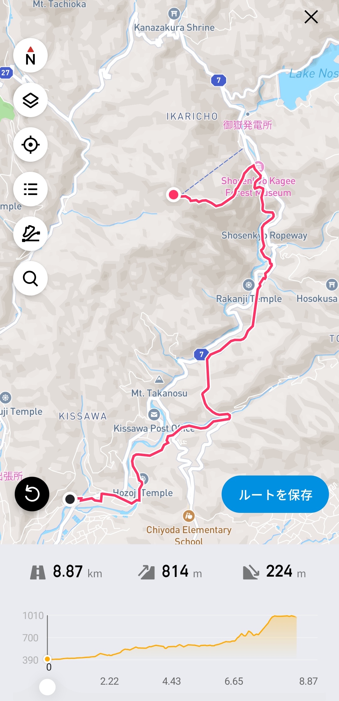 Zeppアプリに取り込んだルート情報は、アプリ内の”マイルート”から確認することが可能。また”ルートを作成”機能を使うことでアプリ内のマップ(おそらくOpenStreetMap)上の道路をなぞったルート作成が可能。ただ、これはあくまでもマップ上に記載の道しか使えないため、登山道でのルート作成はできませんでした。