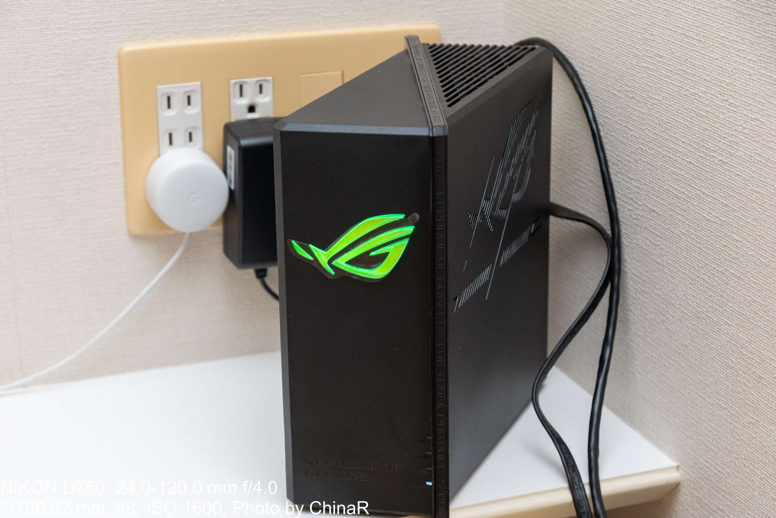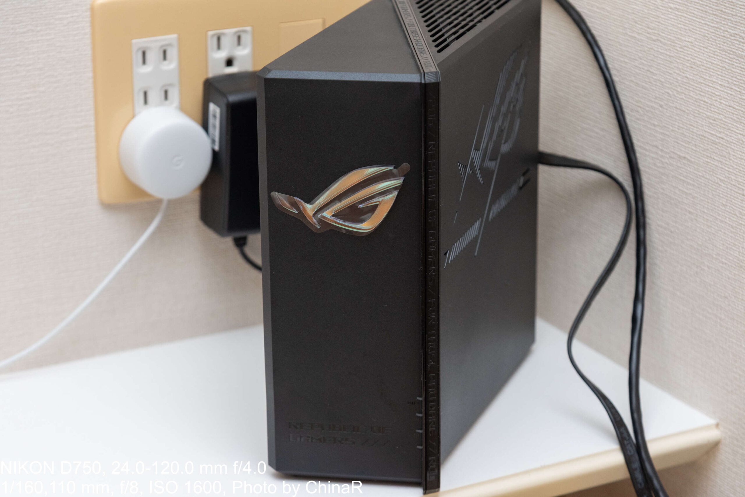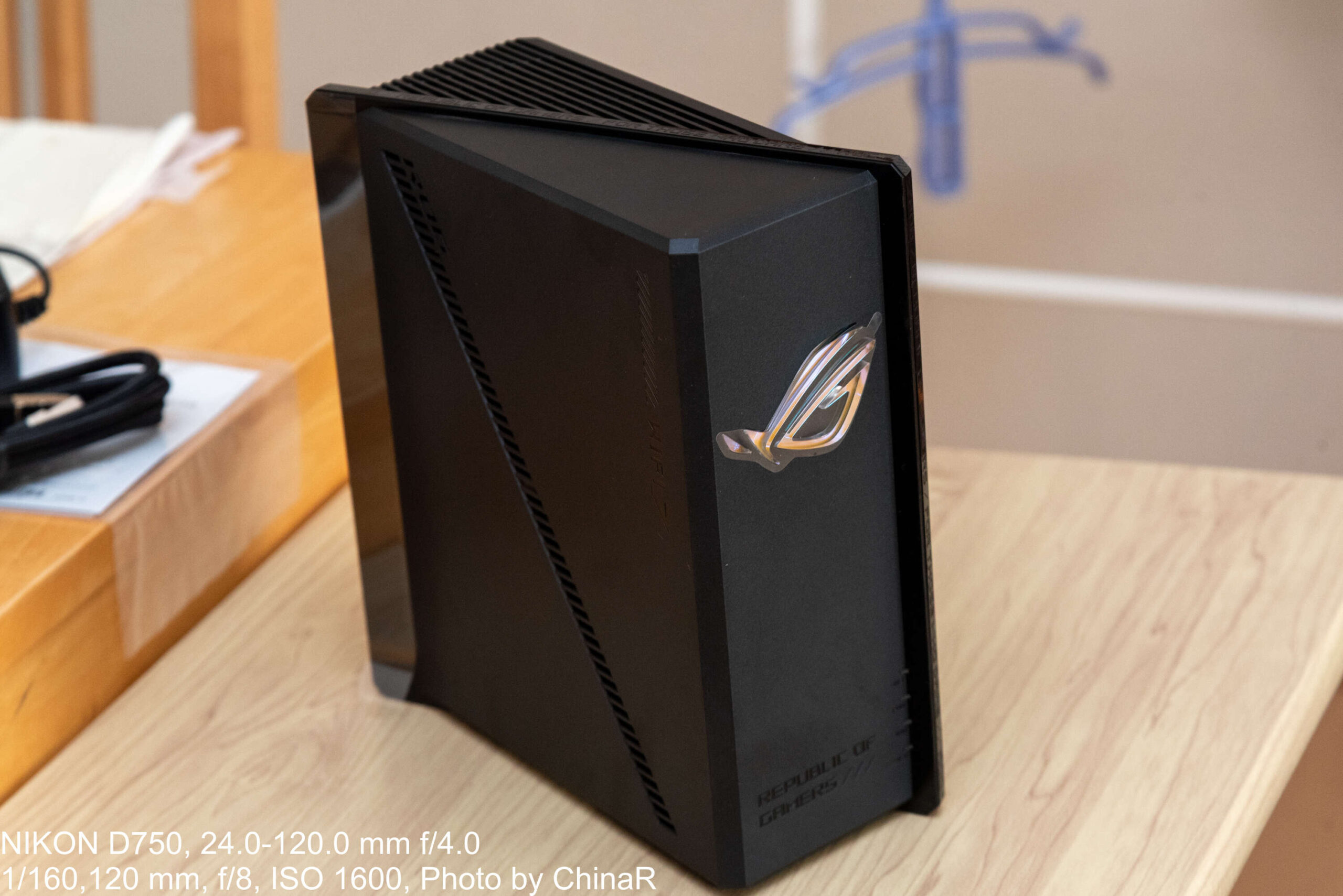 本体外観から確認。ASUSのWi-Fiルーターというと、昔レビューをしたASUS RT-AX1800U(レビュー)のようにアンテナが大きく飛び出して設置場所のスペースを取るいかついデザインの印象がありました。本機は箱型のシュッとしたデザインになっており、縦置きも問題なく可能な構造になっているのがポイント。ただ、ゲーミングブランドであるROGのアイデンティティを強調するかのように少し角にアクセントが入った仕上がりになっています。