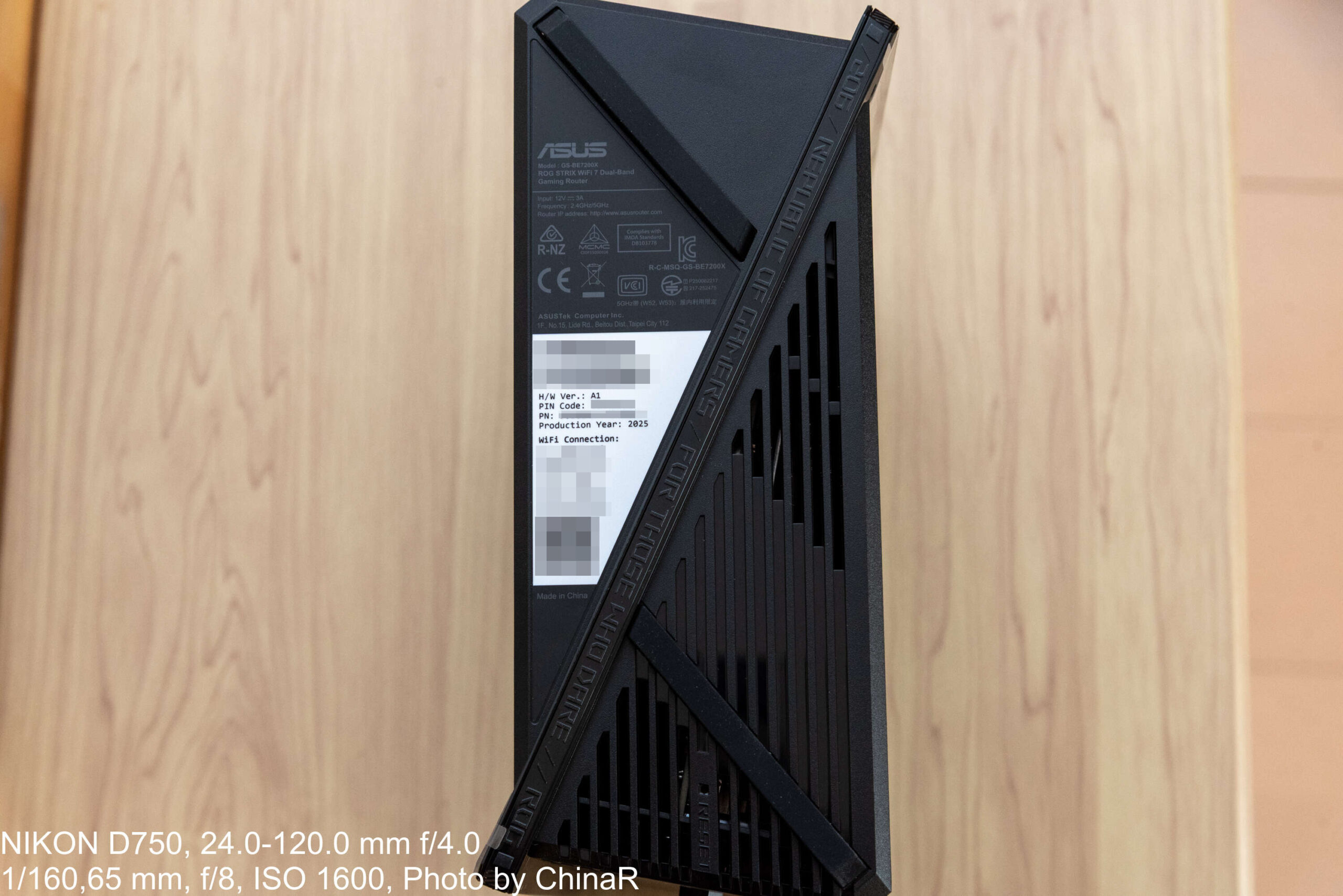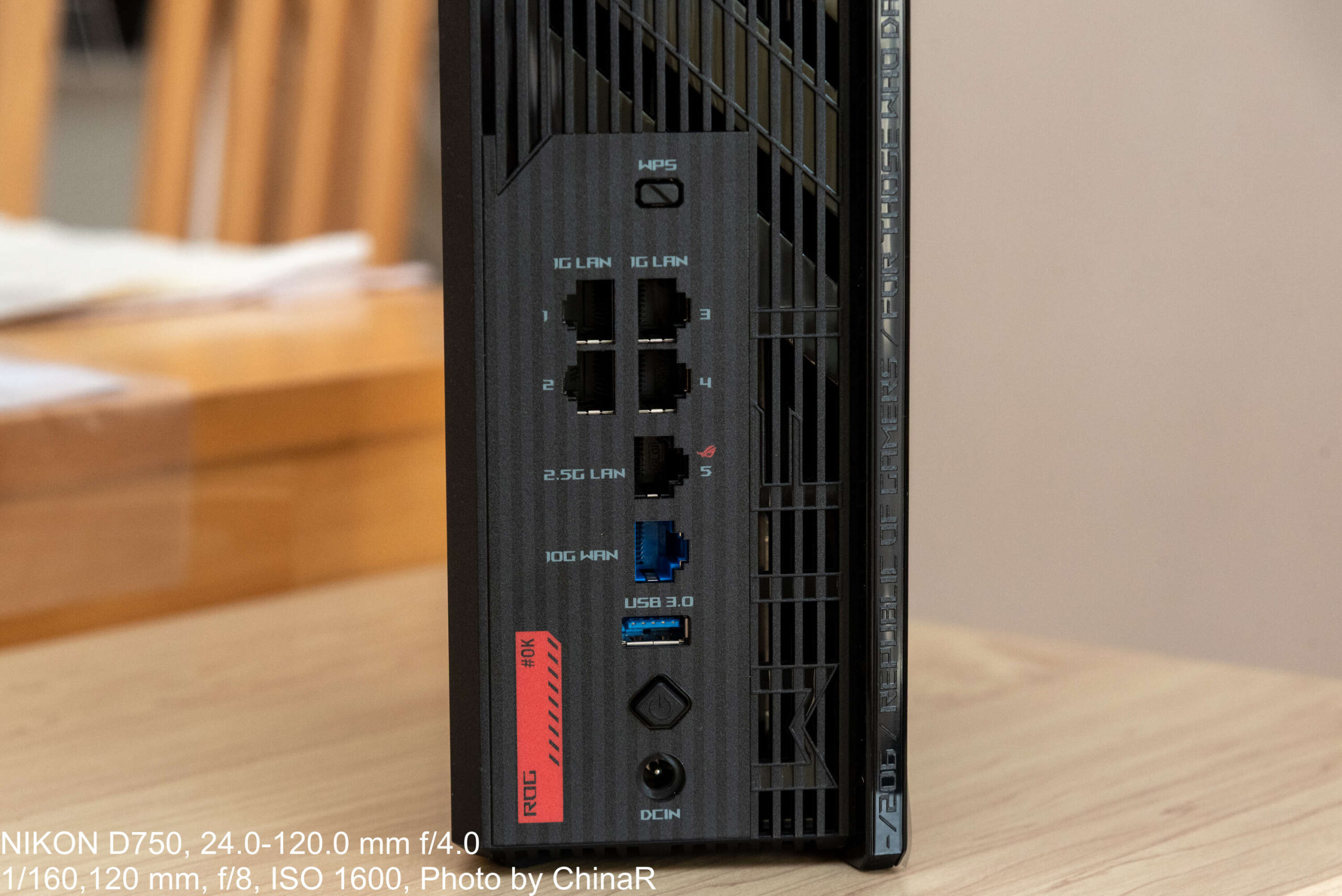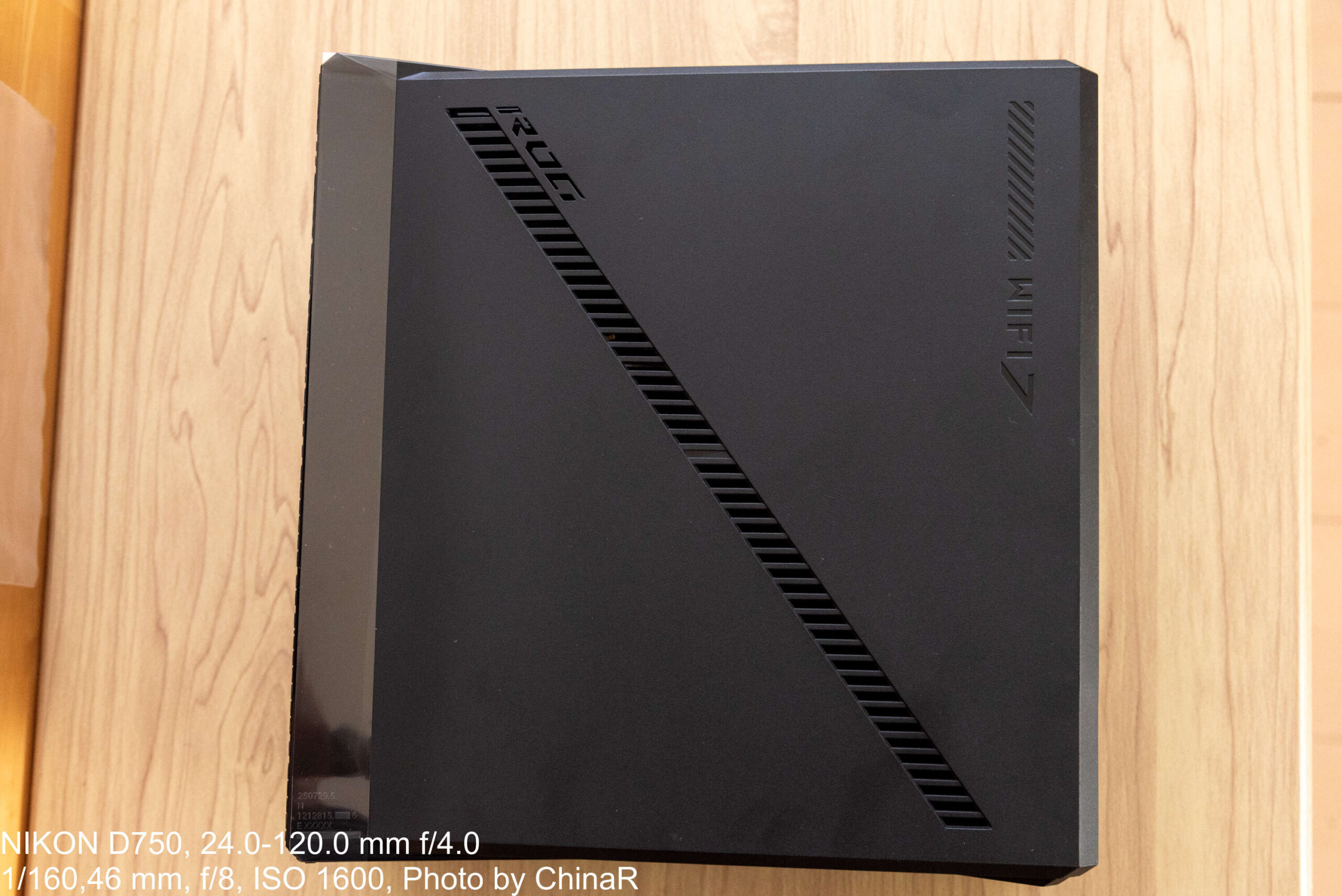 本体外観から確認。ASUSのWi-Fiルーターというと、昔レビューをしたASUS RT-AX1800U(レビュー)のようにアンテナが大きく飛び出して設置場所のスペースを取るいかついデザインの印象がありました。本機は箱型のシュッとしたデザインになっており、縦置きも問題なく可能な構造になっているのがポイント。ただ、ゲーミングブランドであるROGのアイデンティティを強調するかのように少し角にアクセントが入った仕上がりになっています。