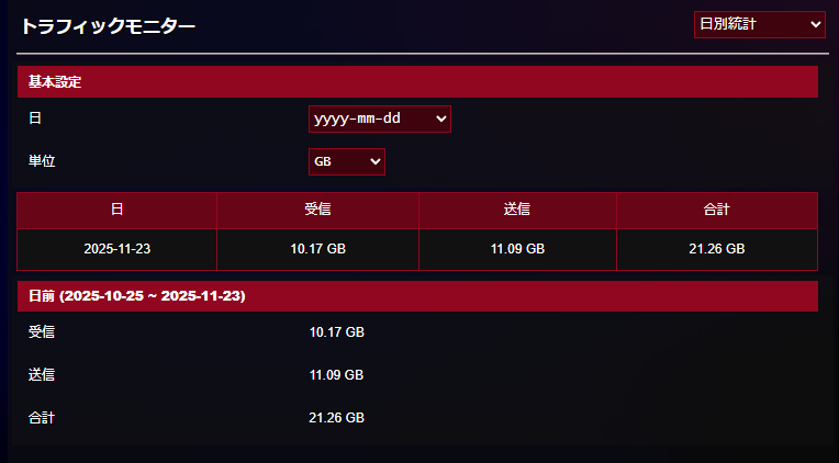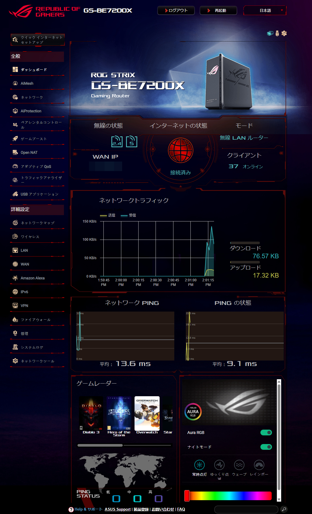 ASUSのWi-Fiルーターはとにかくあらゆることの設定変更が可能なのが特徴。左側のメニュー一覧を見ればわかるように全般設定、詳細設定で20以上のメニューを用意しており徹底的にネットワークに関する設定を行うことが可能です。トップ画面にはネットワークトラフィックについても表示しており、実際の回線の利用状況を一目で確認できます。