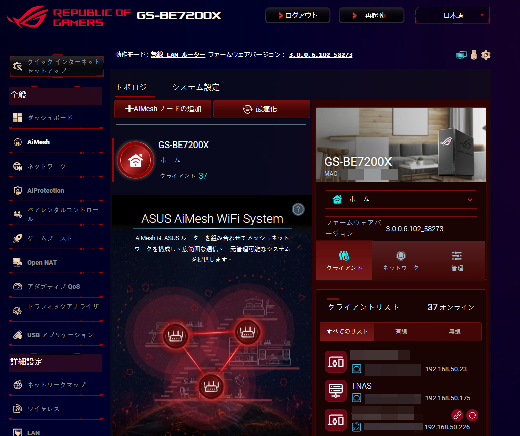 ASUSのルーターはほぼすべての製品が現在はAiMesh対応しているため、古いルーターを持っている場合はそれをクライアント側として有効活用できるようです。なお、EasyMeshに関しては互換性の保障の観点から採用していないんだとか。(インターネットウォッチ・2024/4/22)なお、今回は4LDKのマンション内であれば本機1台で賄えるのでメッシュ化は実施しません。