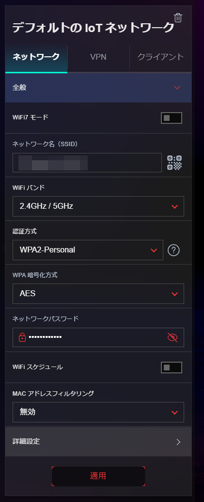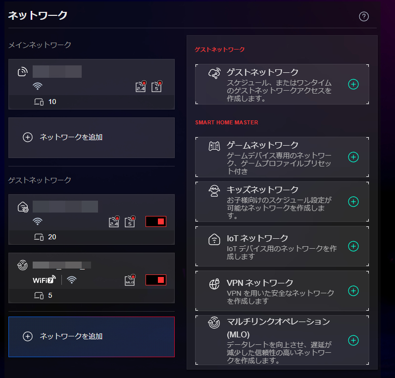ネットワーク設定画面では、ROG Strix GS-BE7200Xで用意するSSIDを管理可能。標準ではWi-Fi 7ネットワークとIoTネットワークが作成されています。Wi-Fi 7の高速通信のポイントとも言えるMLO機能に関しては標準ではOFFになっており、このネットワーク設定からMLOネットワークを用意することになります。