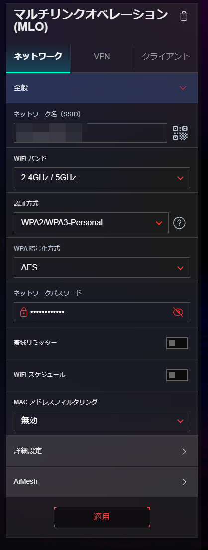 MLOネットワークを作成する際には、”ネットワークを追加”からマルチリンクオペレーション(MLO)を選択し、SSIDとパスワードを設定するだけ。2.4Ghz帯、5Ghz帯の2つの周波数帯を同時に利用することでデバイスとルーター間の接続をより高速化、低遅延、安定化させることが可能です。大容量の通信を行うPCやスマートフォンでMLO対応の機器向けには用意しておくとベターです。