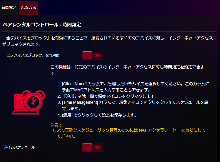 ペアレンタルコントロール機能も搭載。子供がいる家庭では、本機能を利用してデバイスごとにインターネット接続に対する時間指定を行う事が可能です。AdGuard機能ではAdGuard DNSを経由させることで広告やマルウェアサイトへのアクセスのブロックが可能。ただ、DNSを変えるというのはちょっとハードルが高いので私は利用しませんでした。