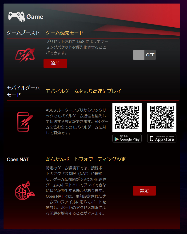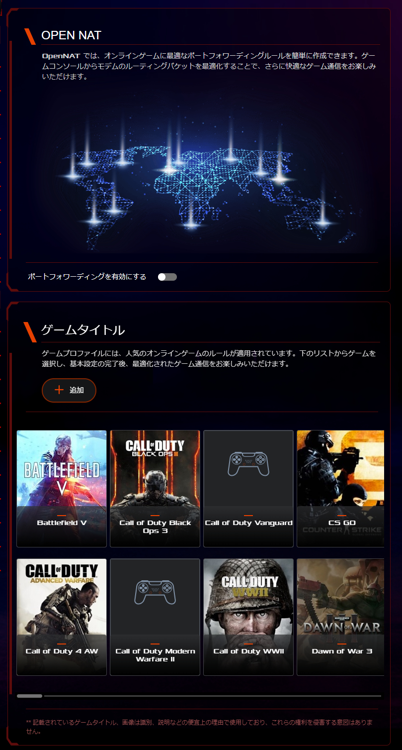 ゲームに関連するモードではゲーム優先モードを用意することが可能。プリセットされたQoSによってゲームに関連する通信を有線化して高速な通信を実現することが可能です。また、OpenNAT機能も用意しており対応するゲームタイトル向けにポートフォワーディングルールをプリセットすることが可能です。通常ポートフォワーディングは自力で設定しますが、自動設定してくれるというのはありがたいポイントです。