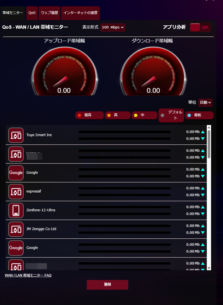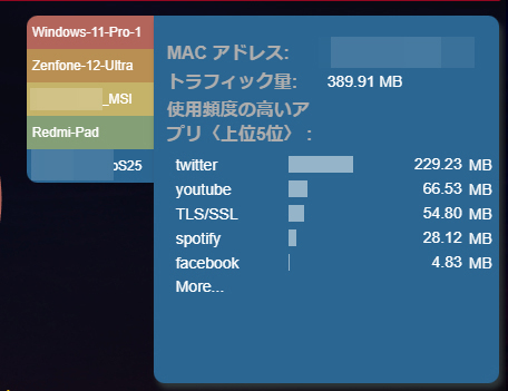 また、各クライアントごとにどのアプリでどれだけ容量を利用したのか、というのも表示できるのも面白いところ。通常のWEBサイトの閲覧に関しては、TLS/SSLでひとまとめになる(https通信なので)ものの、スマートフォンアプリの場合はアプリ名が確認できるのも、実際どれだけ何のために使ったかを可視化できて面白い機能でした。子供がいるような場合には、何のアプリを多く使ったかというのをルーター側からも確認できるので使い道が多そうです。