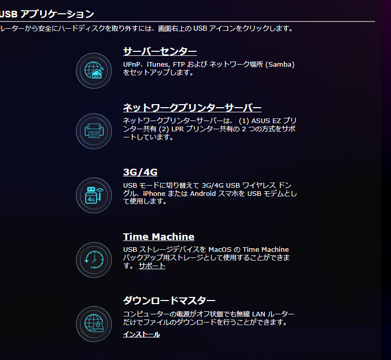 USBアプリケーションのメニューでは、USBに接続した機器についての設定が可能。USB 3.0端子にHDDやSSD、USBメモリを接続した場合にはサーバーとして利用したり、MacOSのTime Machineバックアップストレージにしたり、ファイルのダウンロードサーバーとして使うことが可能です。プリンターを接続してプリンターサーバーにしたり、4G接続可能な機器と繋いでUSB経由でのネットワーク接続ということも可能です。
