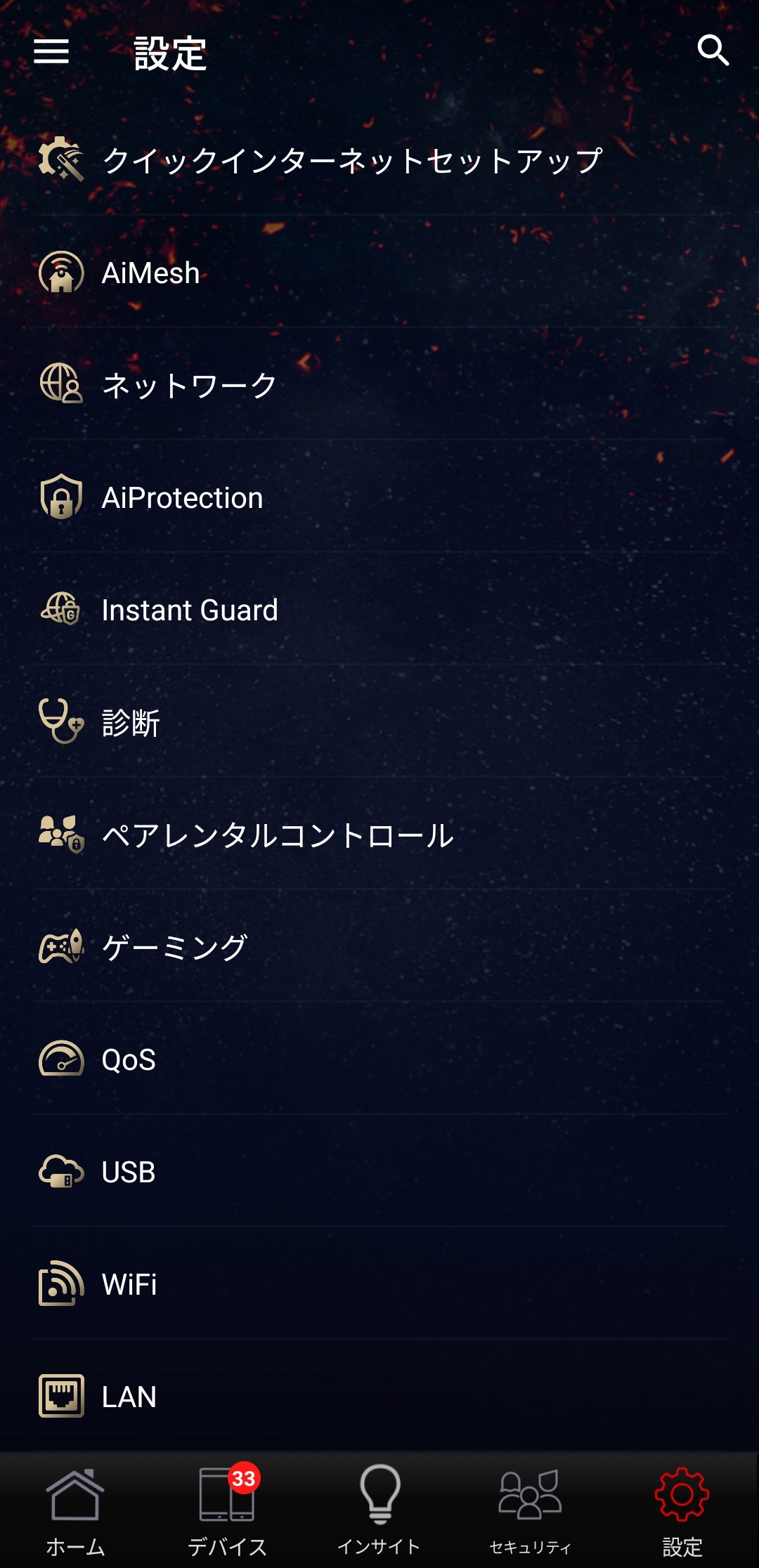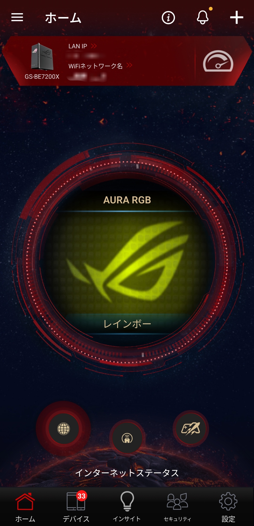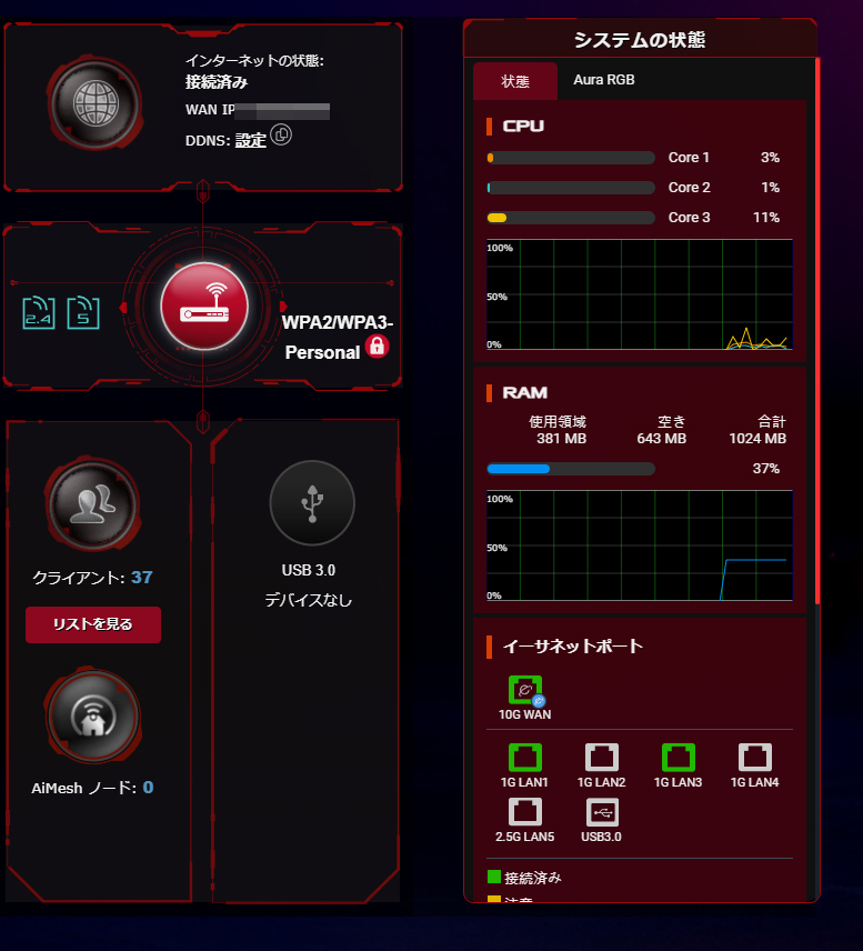スマートフォンからそのまま本機の設定を変更することが可能。ASUS RouterアプリではAURA RGBの状態の変更から現在接続している機器の一覧、Wi-Fiのステータス、各設定を自由に変更することが可能です。基本的にスマートフォンアプリ側で大抵の内容の設定変更が可能なようになっている印象でした。