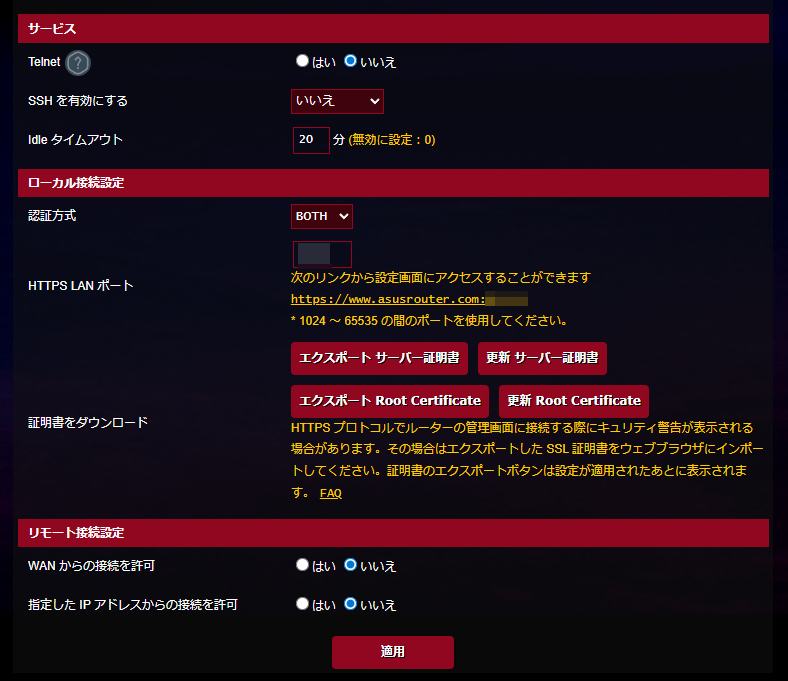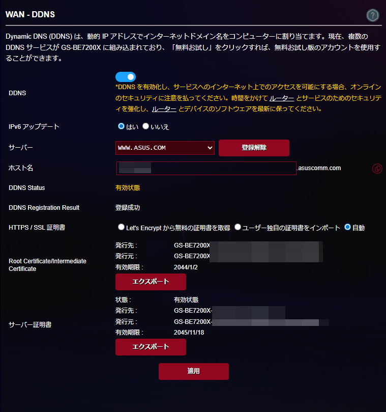 DDNS設定画面にここから移行が可能。グローバルIPアドレスが付与されているというのが前提ではありますがASUSなどの提供するDDNSサービスを利用して簡単に外から自宅まで接続できる環境を整える事が可能です。Let’s Encryptも自動取得可能なためhttpsで安全にWEBサイトを公開することも可能です。マインクラフトサーバーや監視カメラのリモート閲覧なども簡単に行う事が可能です。