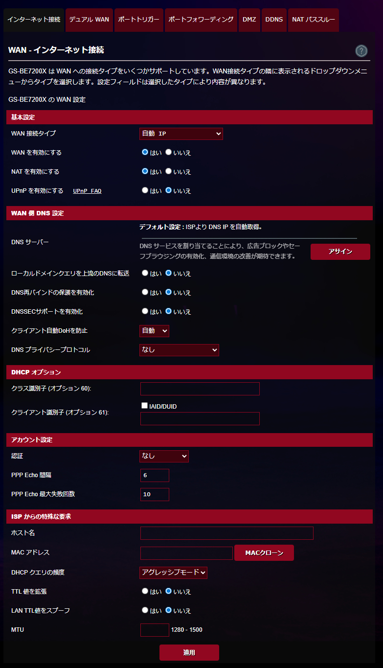 WAN関係の設定は非常に充実しており、利用するDNSを変更することが可能。通常はISPが割り当てるDNSサーバーを利用しますが、広告ブロックが可能なDNSを利用したり、GoogleのDNSを利用することも可能。実際にAdGuard DNSを通してみると広告が激減して驚きます。PC単位でDNSの設定をする必要がないためかなり便利になる印象でした。