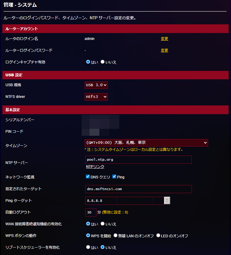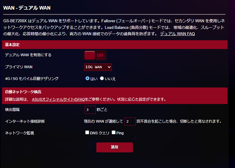 この他特徴的なのがデュアルWAN機能。優先して接続するWAN端子を設定しておいて、一定間隔でネットワークを監視、WANが連続して不具合が起きた場合(Ping or DNSクエリが検知できなかった場合)に自動的に別回線に切り替えることが可能です。モバイルルーターを接続しておいて、障害時にはモバイルルーター経由に切り替えてネットワークを維持させるという使い方ができるわけです。