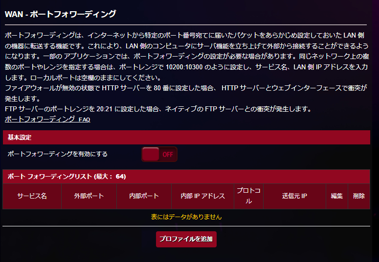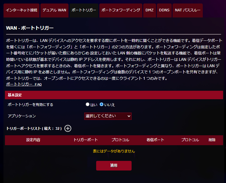 ポートトリガー機能とポートフォワーディング機能にも対応。オンラインゲームやメディアサーバーなどに外出先からアクセスしたい場合には、本機能が必要になることもあるため詳細に設定できるようになっているのは嬉しいポイントです。
