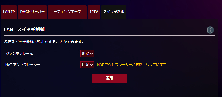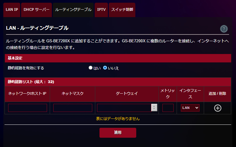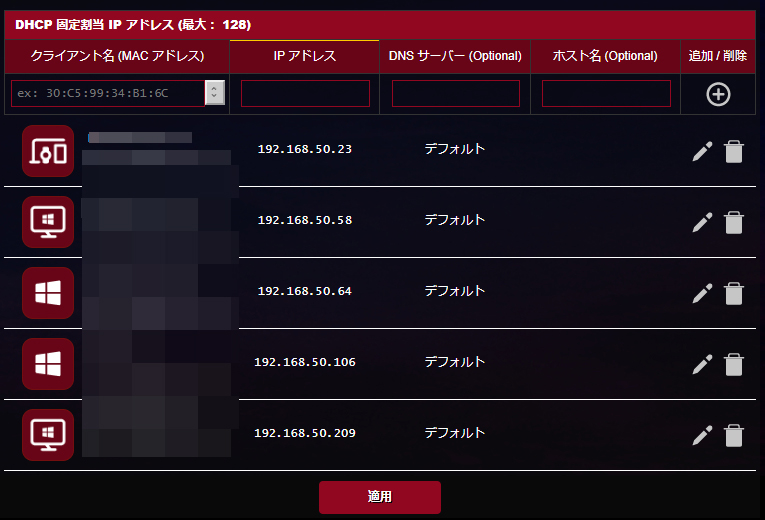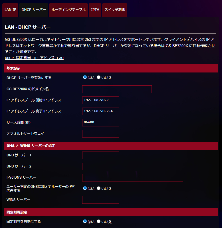 ROG Strix GS-BE7200XのDHCPサーバー機能も優秀で、各機器に対してIPアドレスをあらかじめ設定する固定割当IPアドレス機能は標準で搭載。現在接続している端末のリストをからIP割当を行いたい機器を選択すれば簡単に設定できるので便利でした。NASなどにネットワークドライブを設定したい場合には必須といえます。LANルーティングルールの設定やスイッチ制御も可能でした。